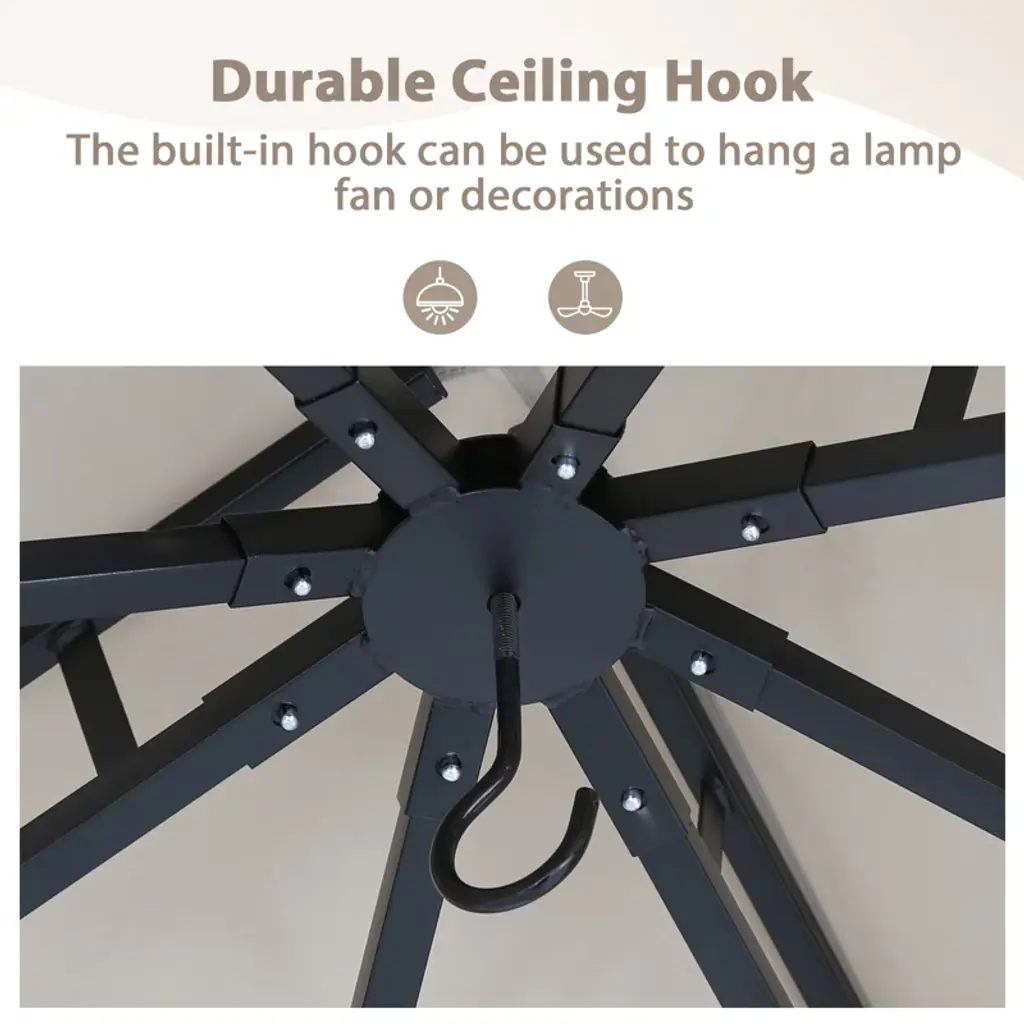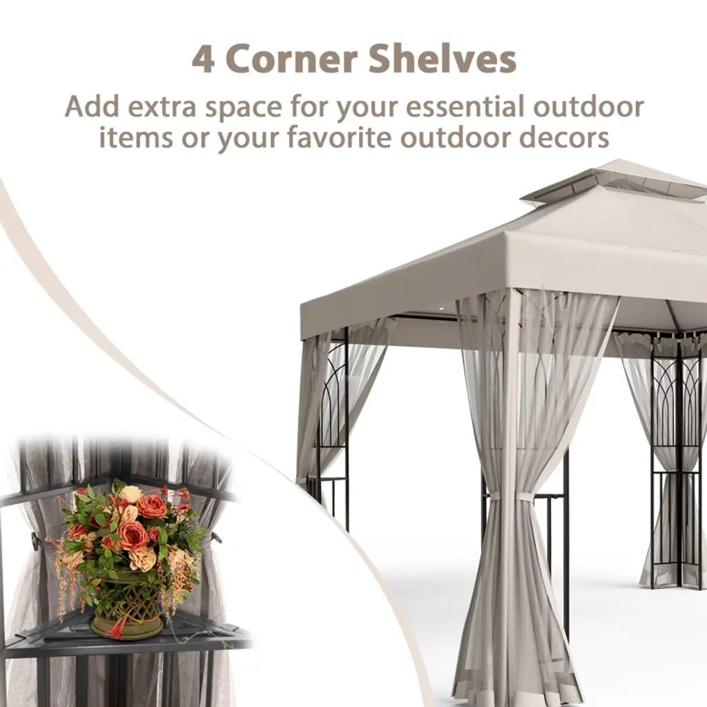 Our gazebo canopy is crafted from high-quality polyester fabric that is tear-resistant and provides UPF 50+ protection against harmful UV rays. The heavier polyester fabric is perfect for providing shade or rain protection. The decorative steel trellis style corner posts feature shelves for added functionality. They are the perfect place for small lights, plants and more.It comes with 4 zippered net walls, ensuring that you can enjoy your time outdoors without worrying about bites. The two-tier roof increases airflow to helps reduce heat while also reducing wind stress on the top, ensuring extra stability in windy conditions. The screened gazebo great for hosting a family get-together.