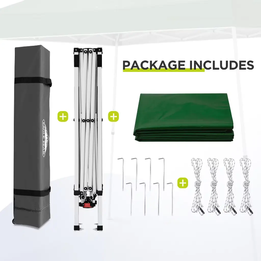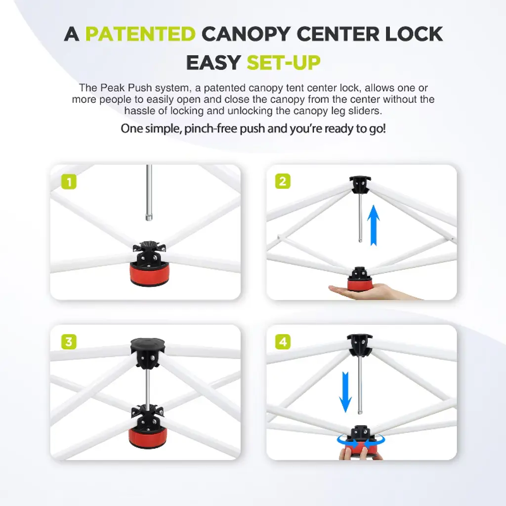 This pop-up canopy tent features the Peak Push system, a patented center lock that allows tool-free setup and quick opening and closing from the center. It offers three adjustable heights, making it convenient to use and safe and reliable.This canopy is carefully crafted with durable Oxford fabric and coated with high-quality silver material, providing excellent UPF 50+ sun protection and drizzle resistance. The supporting frame is made of strong powder-coated metal, ensuring it remains sturdy in various conditions. Additionally, you can secure the canopy to the ground using wind ropes and stakes, adding even more stability for your peace of mind. The packaging is compact and suitable for storage in the trunk of a vehicle.