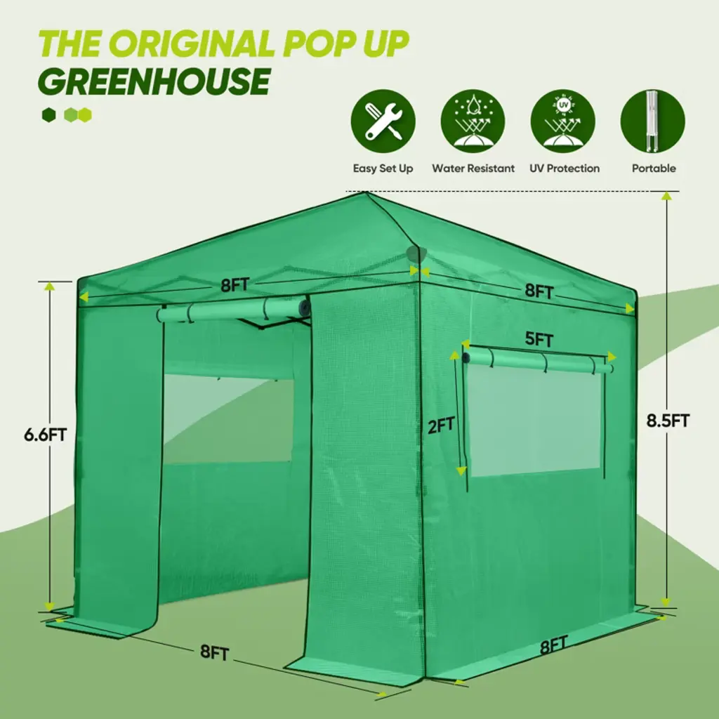 Eagle Peak 8'x8' Instant Pop-up Greenhouse, Roll-up Zipper Doors And Side Windows, Green