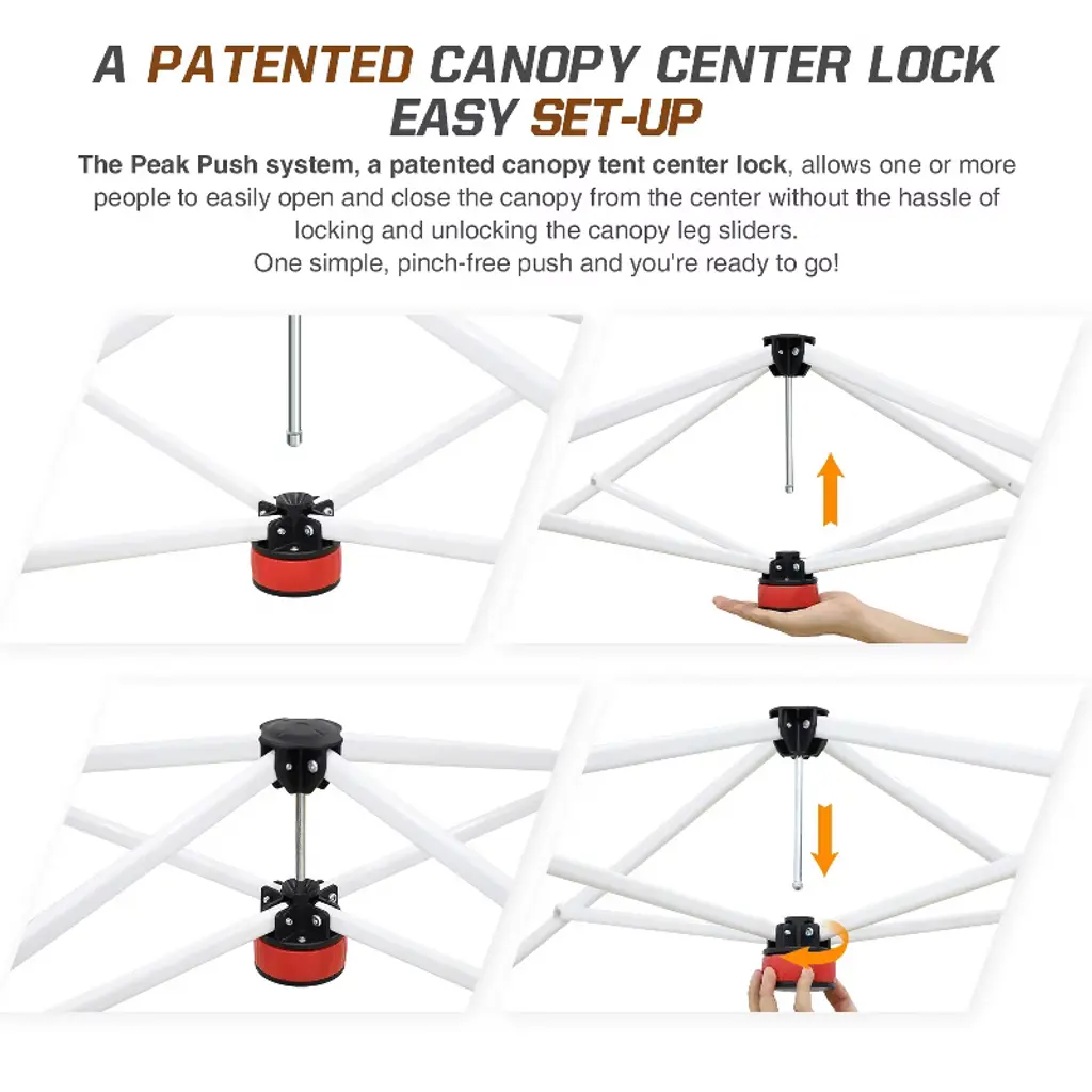 This pop-up canopy tent features the Peak Push system, a patented center lock that allows tool-free setup and quick opening and closing from the center. It offers three adjustable heights, making it convenient to use and safe and reliable.This canopy is carefully crafted with durable Oxford fabric and coated with high-quality silver material, providing excellent UPF 50+ sun protection and drizzle resistance. The supporting frame is made of strong powder-coated metal, ensuring it remains sturdy in various conditions. Additionally, you can secure the canopy to the ground using wind ropes and stakes, adding even more stability for your peace of mind. The packaging is compact and suitable for storage in the trunk of a vehicle.