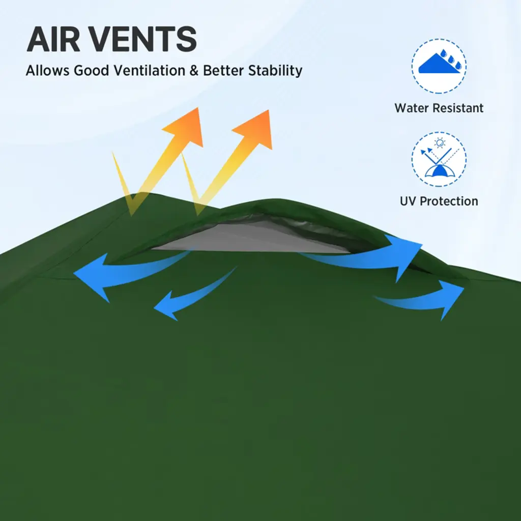 The portable canopy requires no tools and easily opens and closes from the center in seconds.Spend less time on set-up and more time enjoying the great outdoors.Whether you’re camping, tailgating, or at any outdoor event, this portable tent gives you plenty of shade and fresh air to keep you comfy. It’s made from CPAI-84 flame resistant 150D oxford fabric and designed so one person can put it together without breaking a sweat. The canopy fits in a 600x300D compact wheeled bag, making it super easy to carry around. Plus, the stakes that come with it make sure it stays put on any kind of ground. Feel confident out there knowing you’re protected from the sun and light rain. Make every get-together something special with this reliable and stylish canopy!