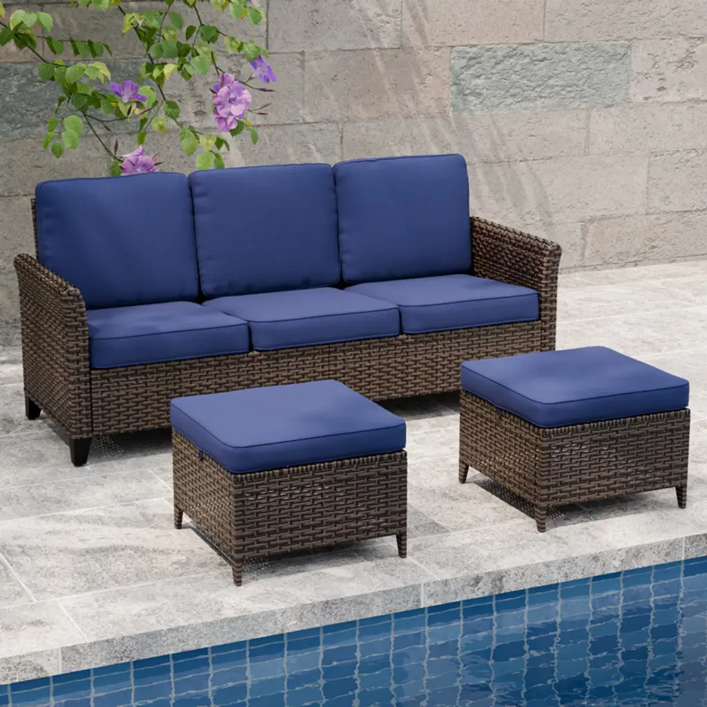 Eagle Peak Ocean Vista 3 Piece Outdoor Wicker Couch Sofa, Variated Wicker Conversation 3-seat Sofa Set With Ottomans, Blue
