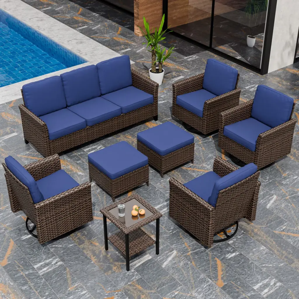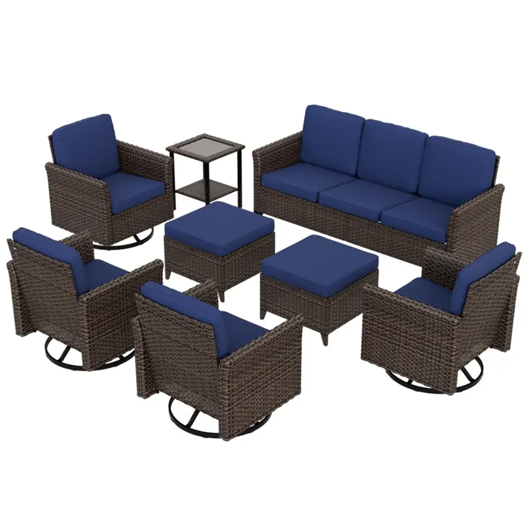 Eagle Peak Ocean Vista 8 Piece Patio Variated Brown Wicker Conversation Sofa Set Swivel Chairs, Blue Cushions