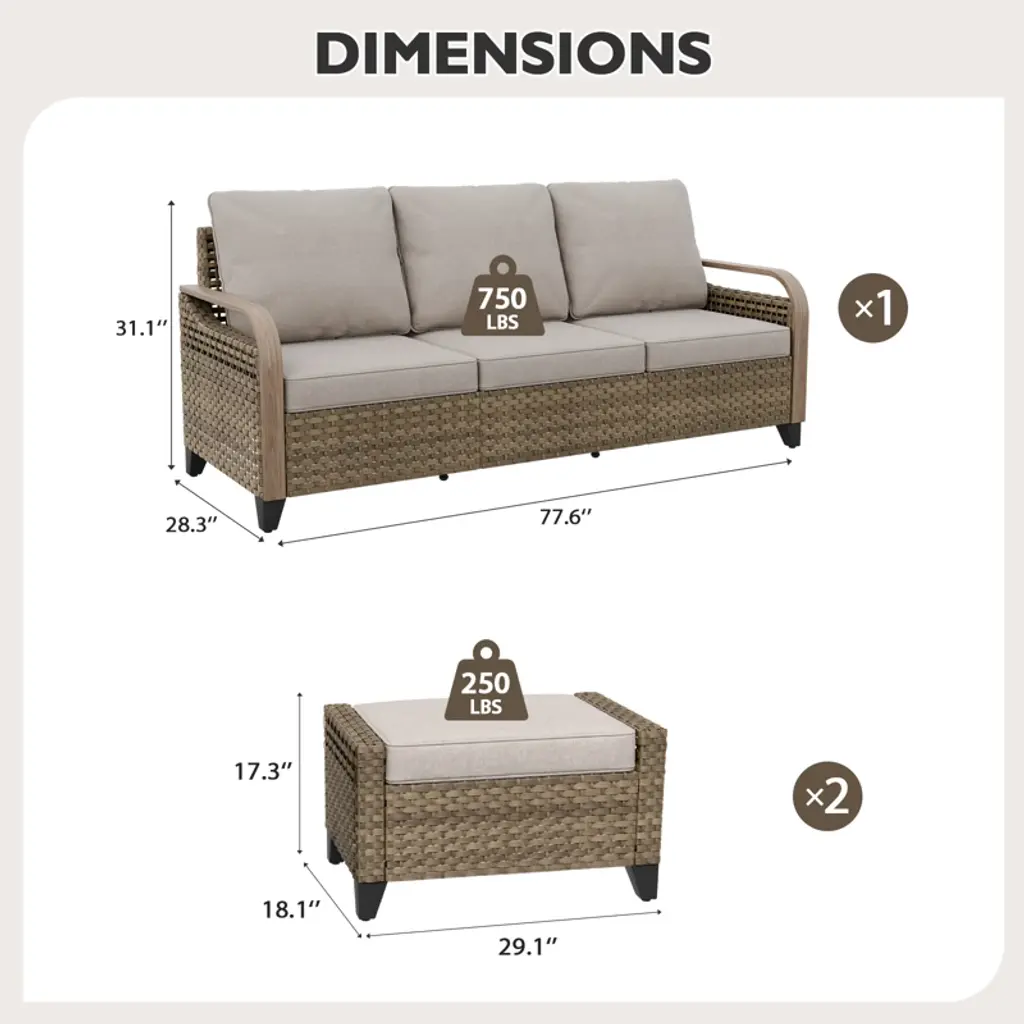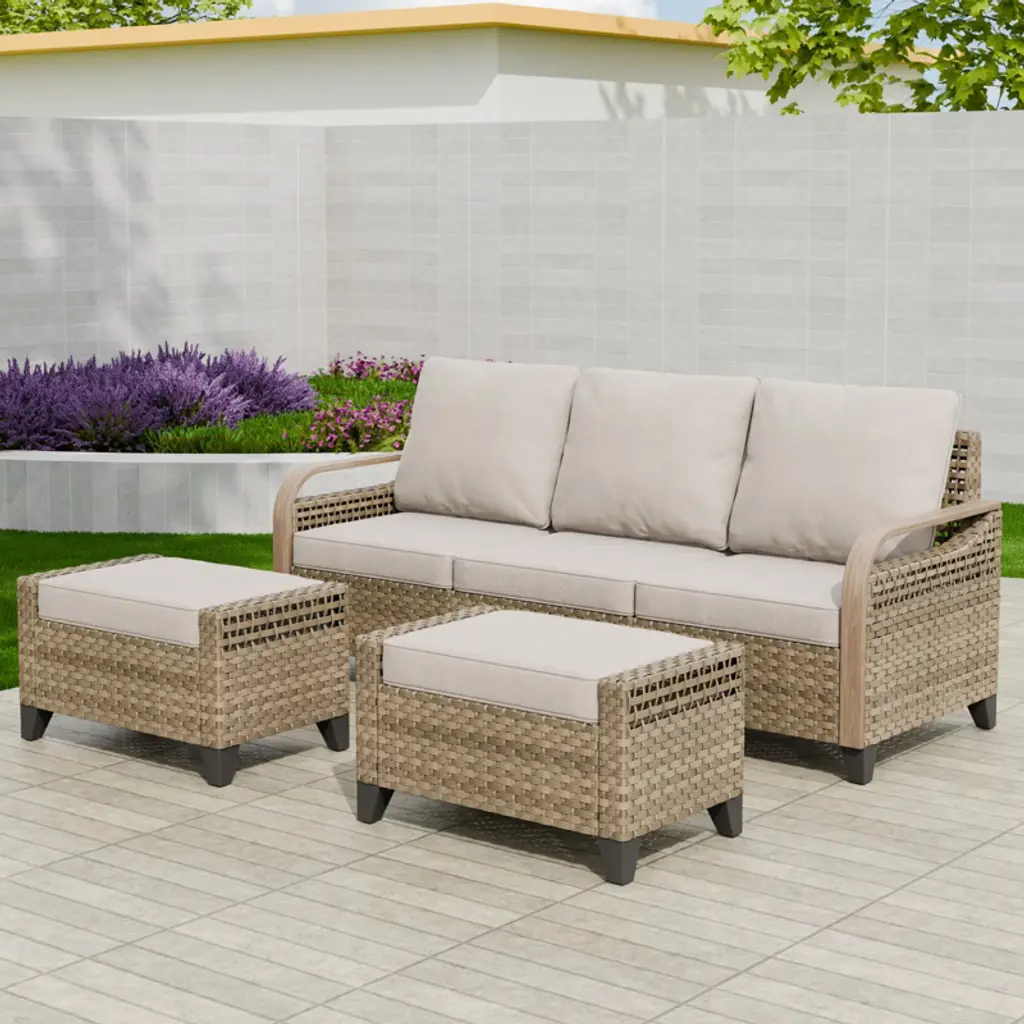 Eagle Peak Outdoor Rattan Furniture Set, Wicker Patio Couch, Pe Rattan 3-seat Sofa With Ottoman