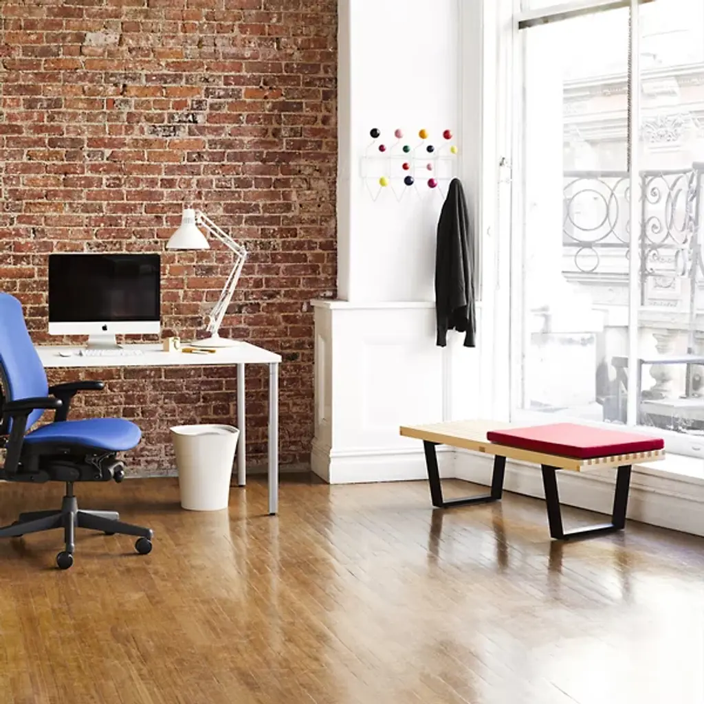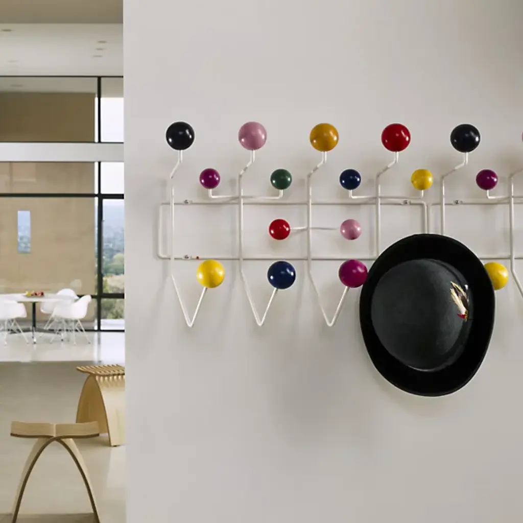 Charles & Ray Eames quite often infused their functional designs with a sense of play. Nowhere is this more evident than in the whimsical geometric form and numerous wooden spheres of the Eames® Hang-It-All Coat Hanger by Herman Miller. This inventive piece is also strong, made of welded steel with drywall anchors for secure mounting.