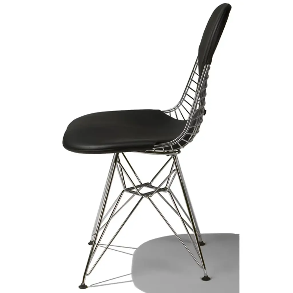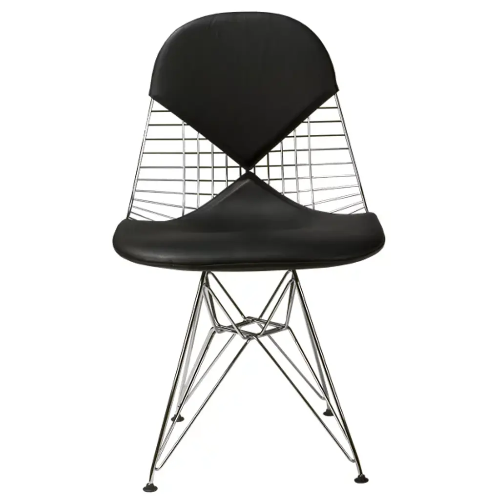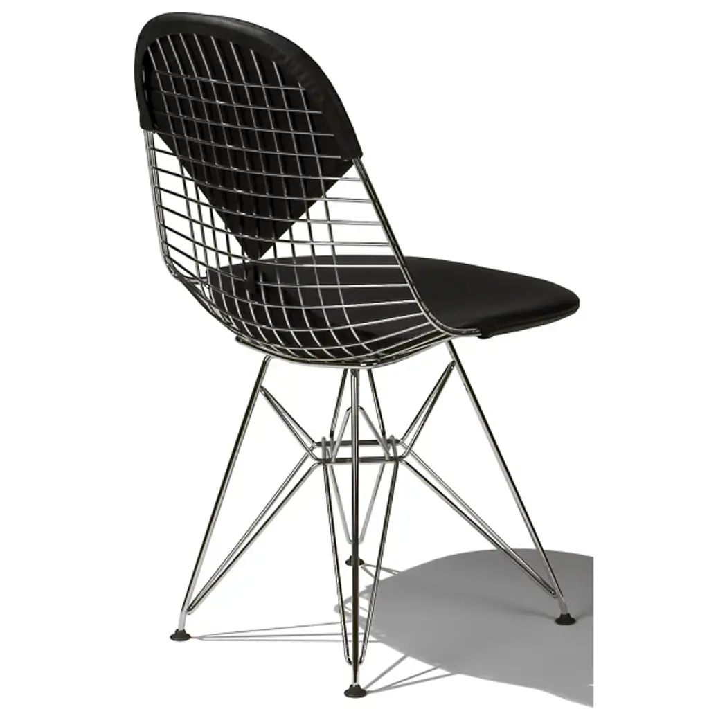 The classic form of the original Wire Chair, but dressed a bit more discretely. The Eames® Wire Chair with Bikini Pad by Herman Miller® features a two-piece leather-covered pad to cushion the seat and head. The chair underneath is lovely and architectural, with a subtly curved welded metal wire seat and intricate "Eiffel Tower" base.