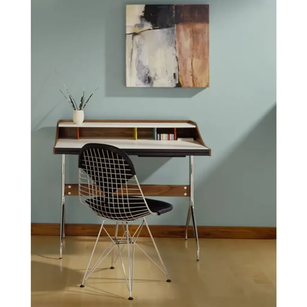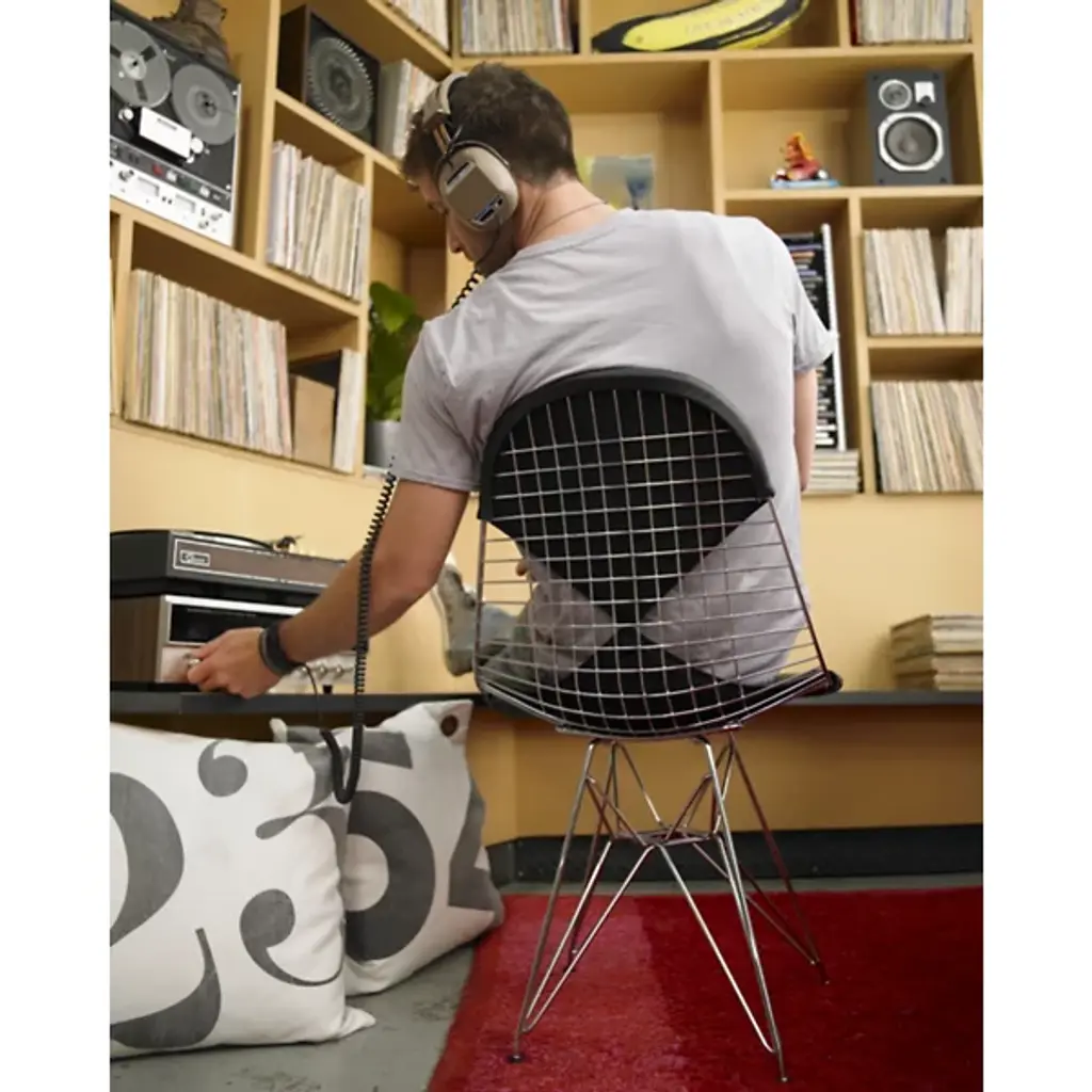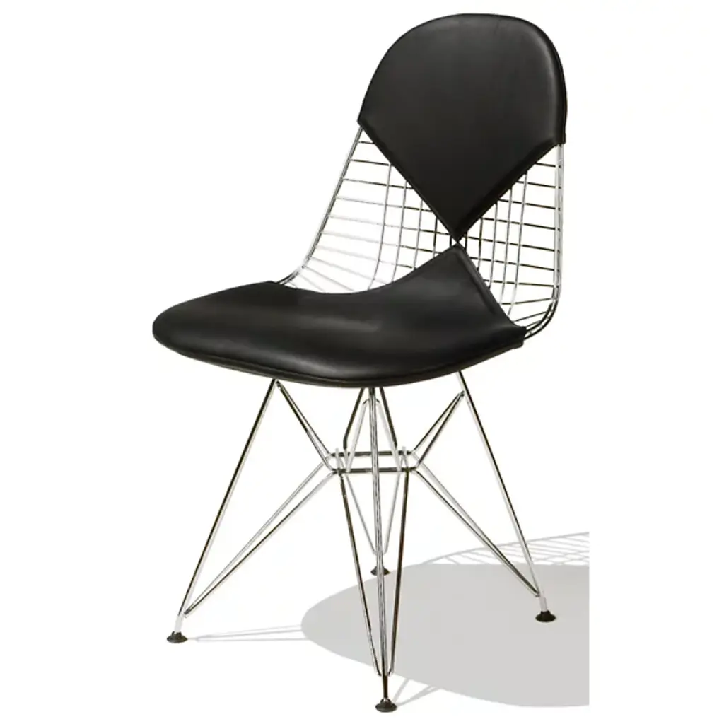 The classic form of the original Wire Chair, but dressed a bit more discretely. The Eames® Wire Chair with Bikini Pad by Herman Miller® features a two-piece leather-covered pad to cushion the seat and head. The chair underneath is lovely and architectural, with a subtly curved welded metal wire seat and intricate "Eiffel Tower" base.