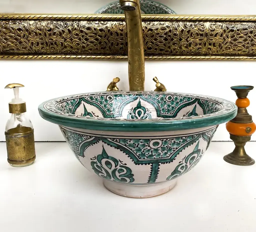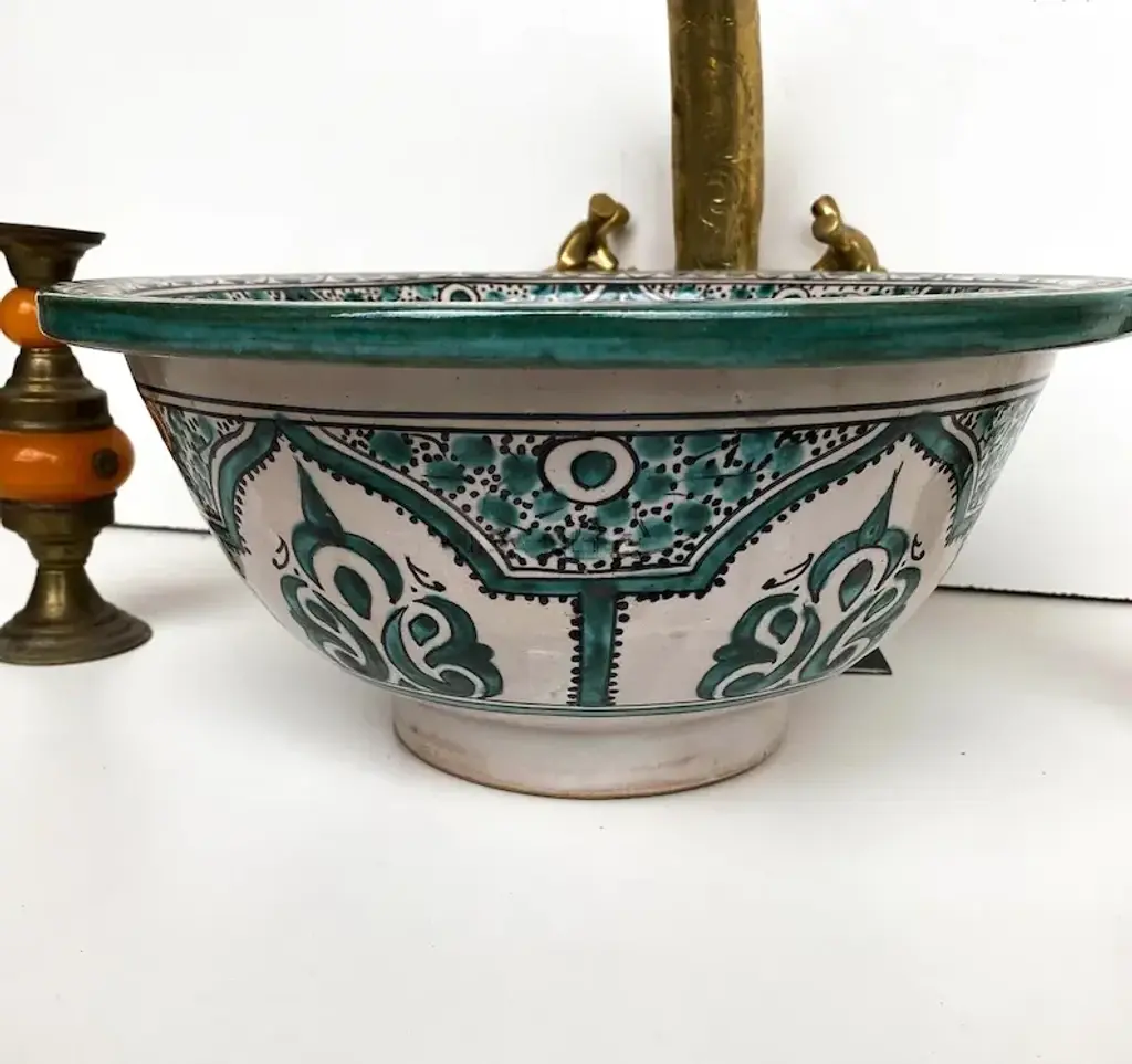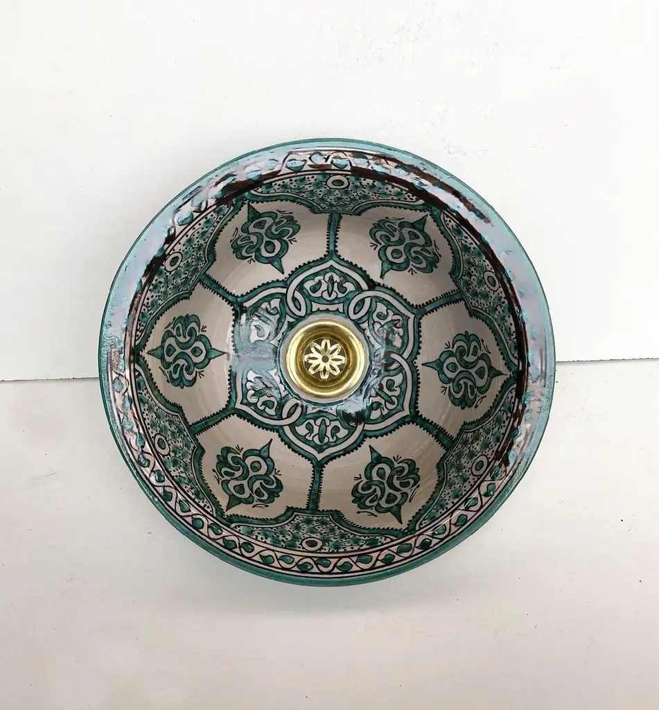 The NUSHI' basin features traditional Andalus motifs and patterns, drawing on the gorgeous antique ceramics found across the region. Combining sumptuous antique White with Olive Green and, the basin is a feast for the eyes, bringing glamour and opulence to bathroom interiors. high quality and painted by craftsmans. Brass faucet not included. We appreciate Your Visit {Essahly}