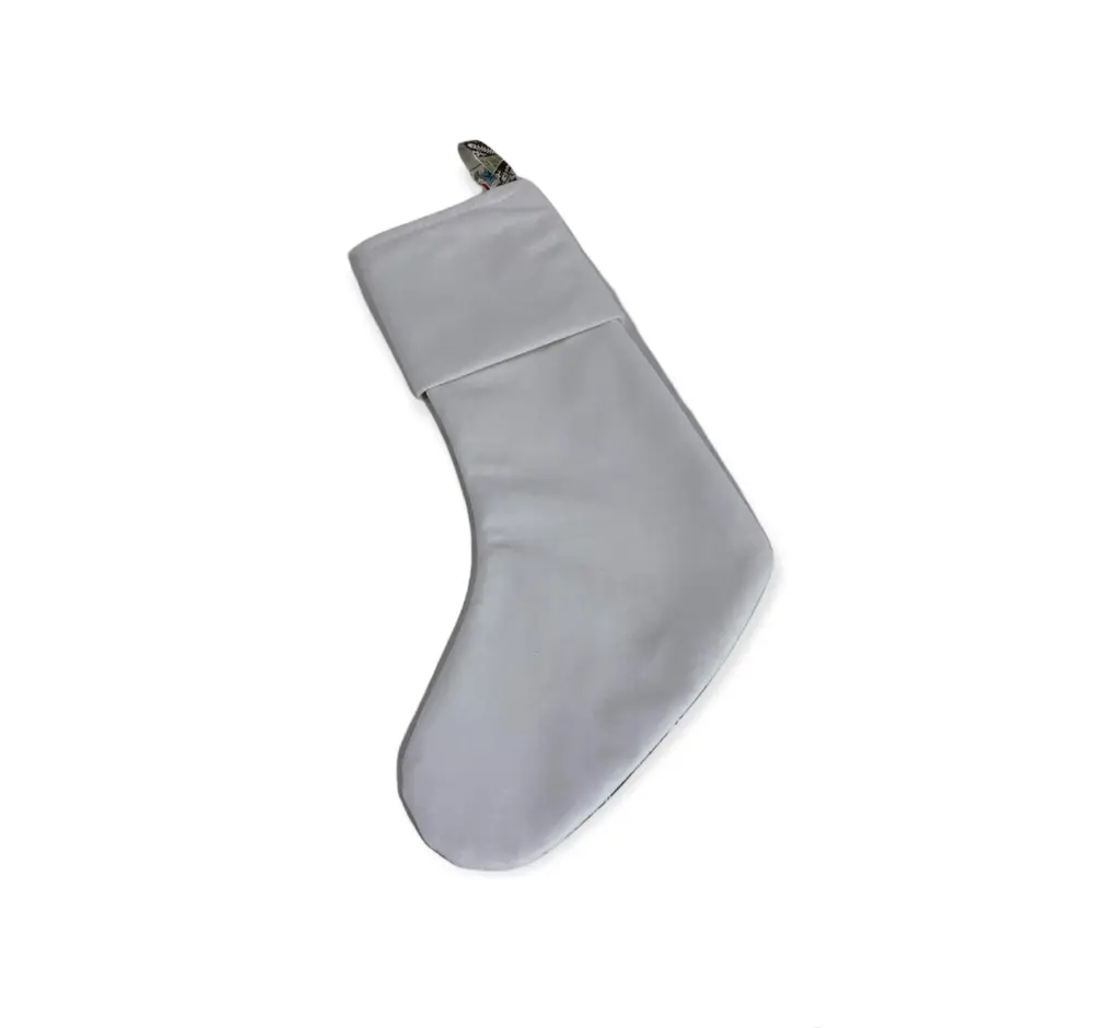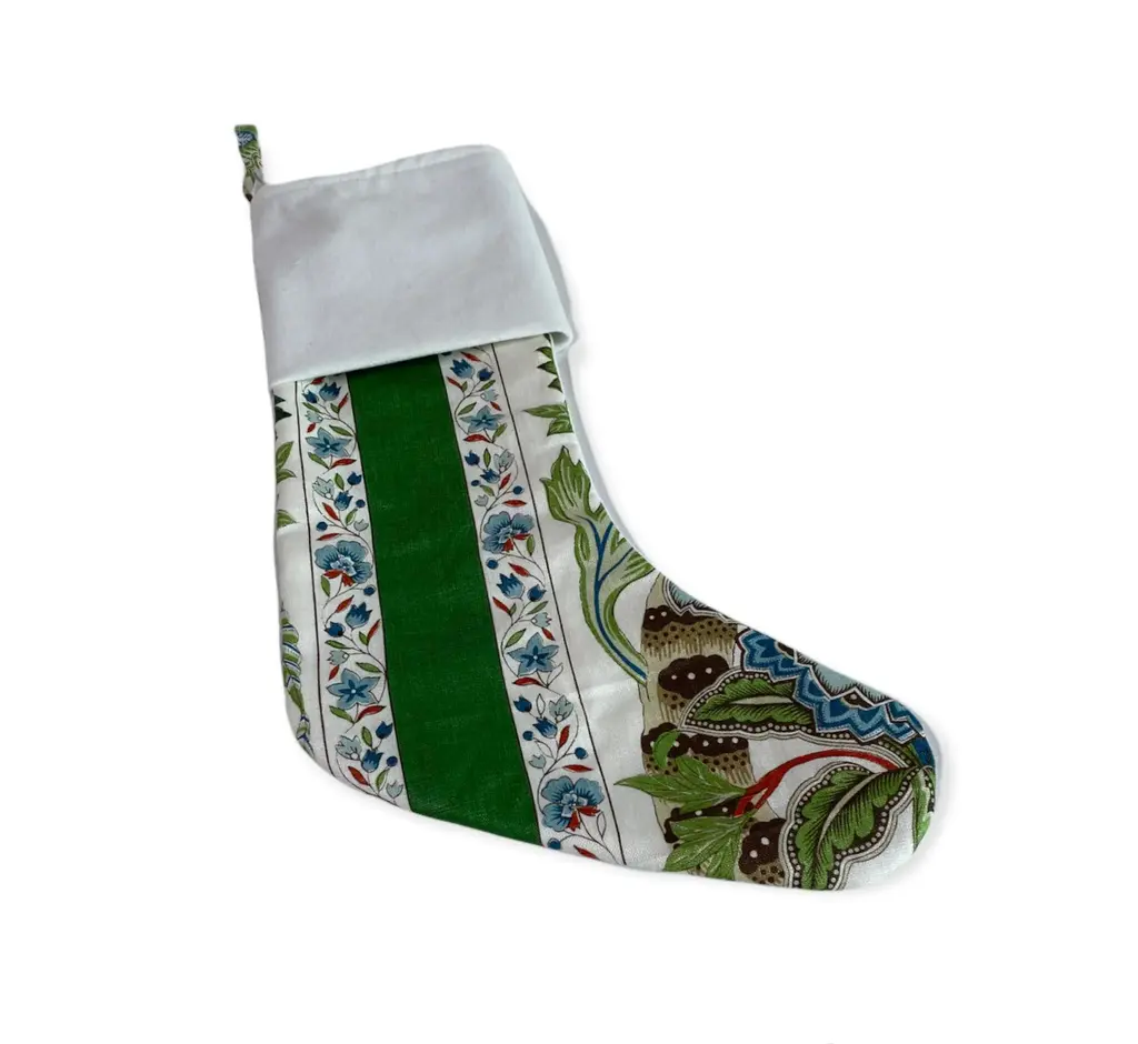 Custom Schumacher Anhou stripe christmas single sided stocking with a matching white backing for a clean finish. Design placement may vary. Designed with a custom white cuff and matching durable hanging loop for a clean finish.