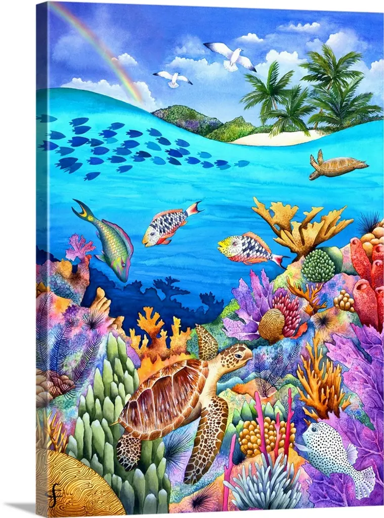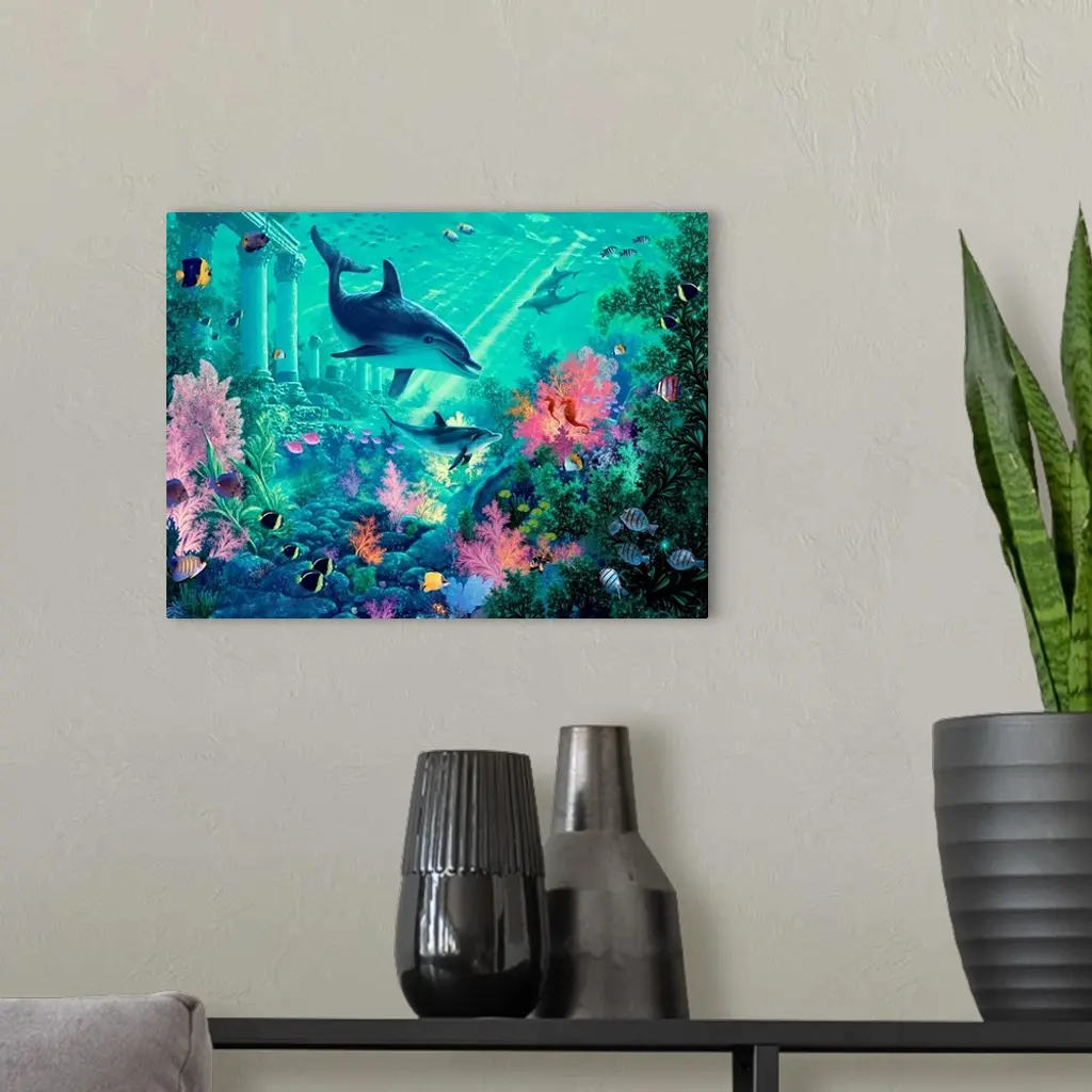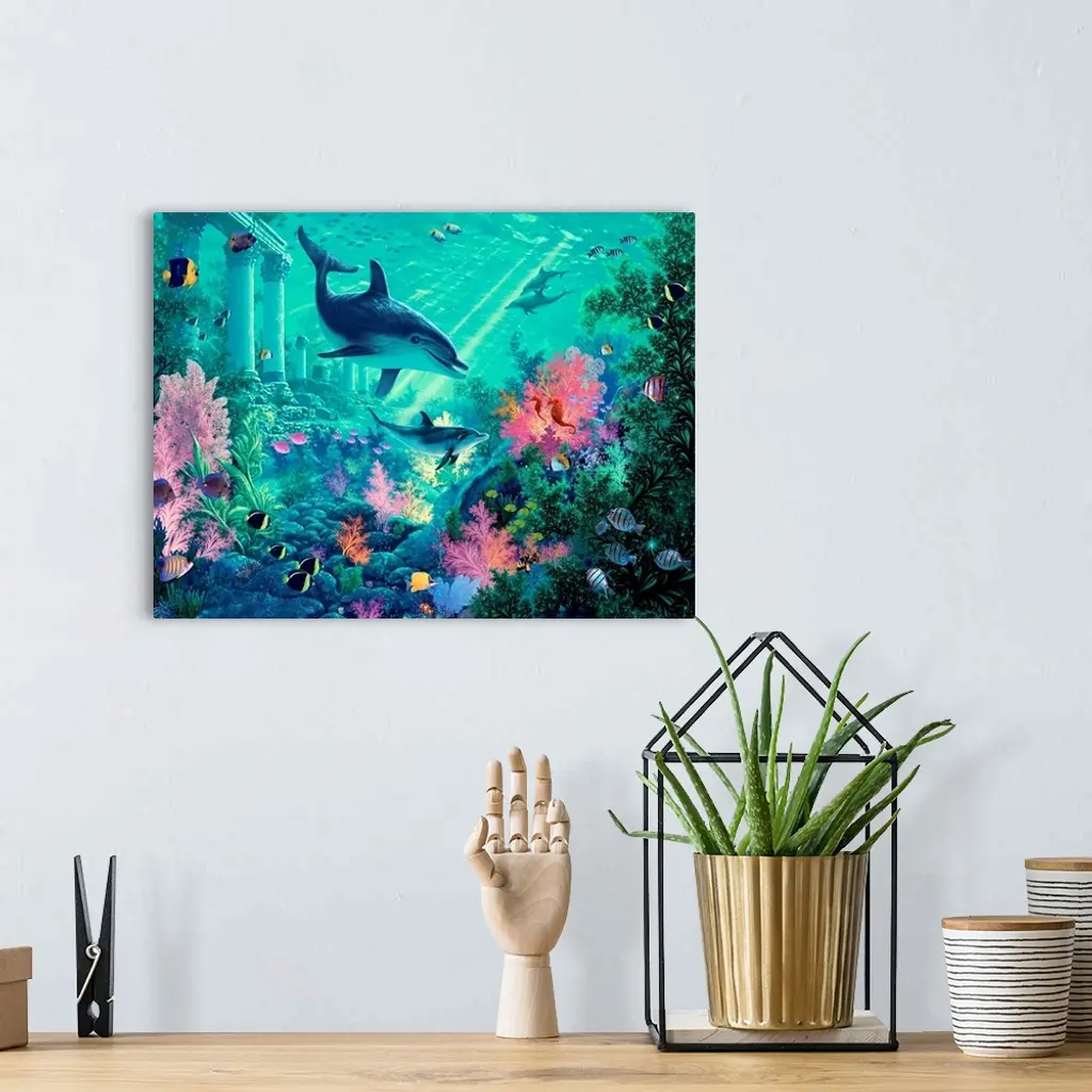 Contemporary fantasy art of dolphins swimming underwater near column structures and colorful coral.