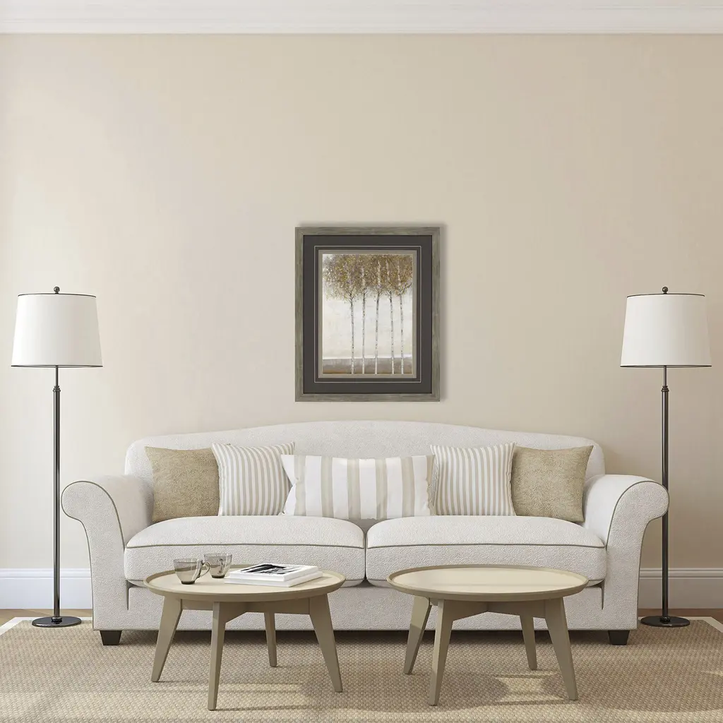 Trees in neutral beige and gold, double matted with v-groove and framed under glass and finished in a repurposed wood look frame.