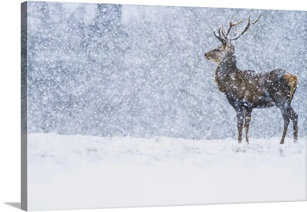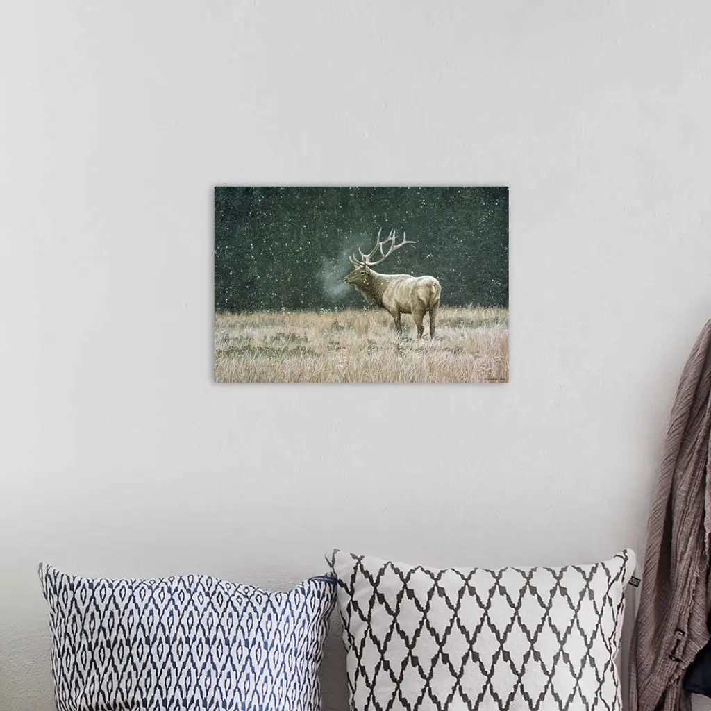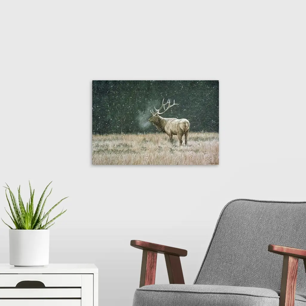 Mist rises from an Elk's mouth as it stands in a grassy field, snow falling from the sky.
