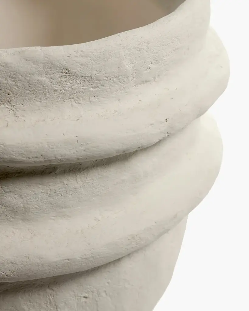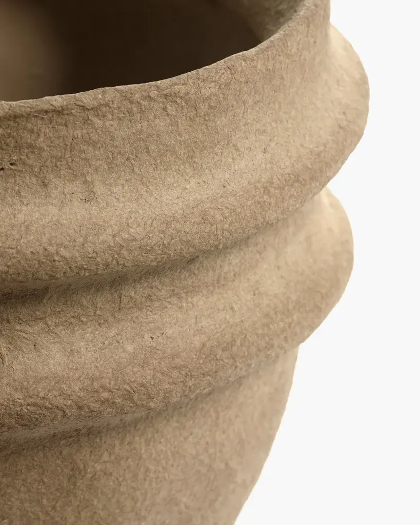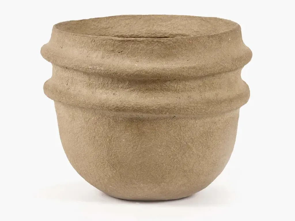 Earth is a round paper mache flower pot.Marie Michielssen’s successful Earth series, made of that special material, papier mâché, was extended with a number of bowls, vases and pots in off-white and natural brown.The Earth collection by Marie Michielssen stems from her love for paper, prints, and the reuse of materials. She has crafted vases, lamps, and decorative objects with a traditional character reflected in both the texture and the organic shapes. The poetic atmosphere created by the papier-mâché material beautifully balances these home décor pieces between art and design.