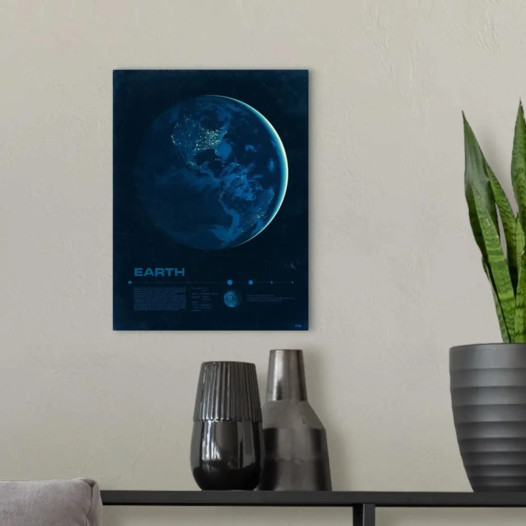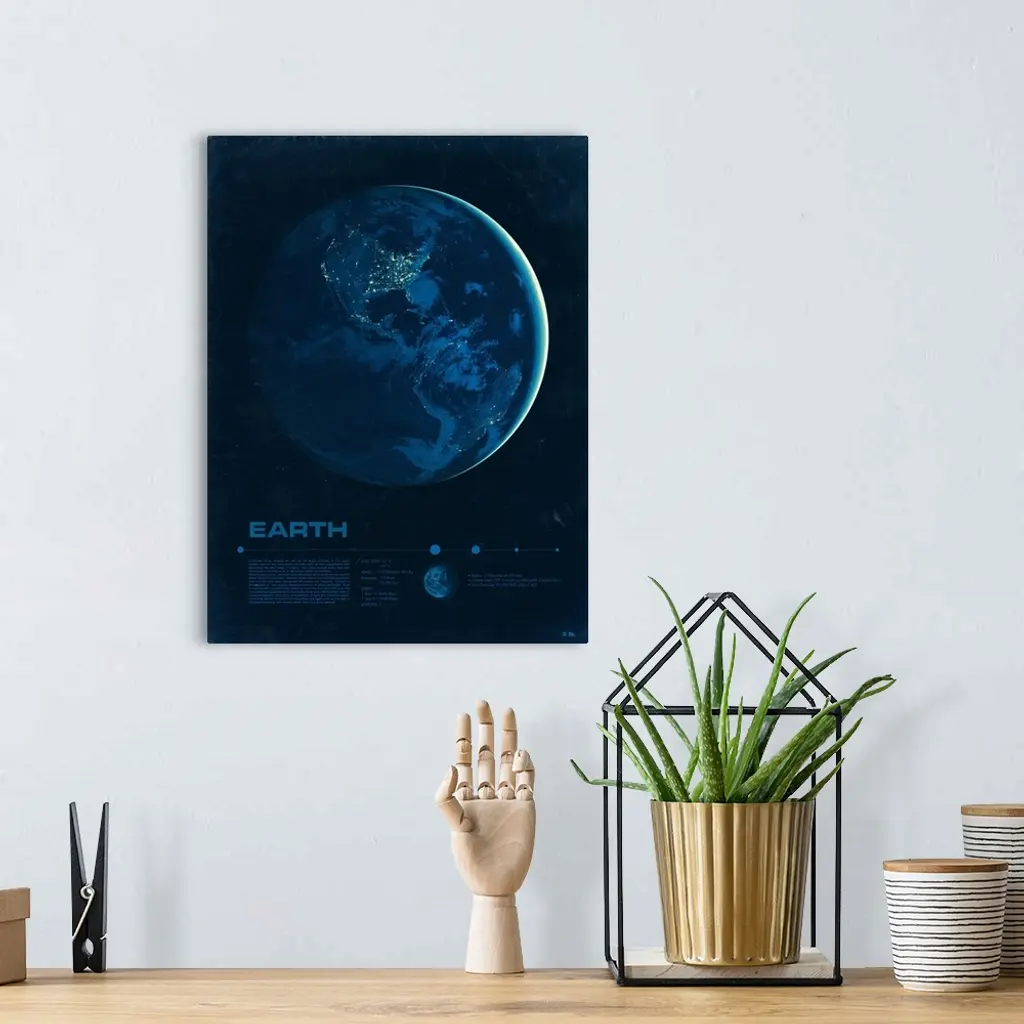 Educational graphic poster of Earth with written facts at the bottom including average temperature, mass, diameter, orbit, and a diagram. Write up reads: "Scientists have looked for life on all eight planets of our solar system, but so far, only earth has life and all the ingredients that generate life and keep it happy. No other planet even has any amoebas or bacteria on it, let alone plants or animals.What keeps plants, animals and amoebas alive and well on earth? Water, first and foremost. Without water, the vital chemical reactions that nourish and even generate life would not happen. Carbon is also essential. No carbon dioxide means no photosynthesis. Add to that earth?s comfortable distance from the sun, plus the way the atmosphere regulates earth?s temperature, plus the fact that earth?s electromagnetic field and atmosphere screen out harmful radiation while letting in beneficial radiation like light, and you?ve got a delicate balance that makes earth one very lively planet."�