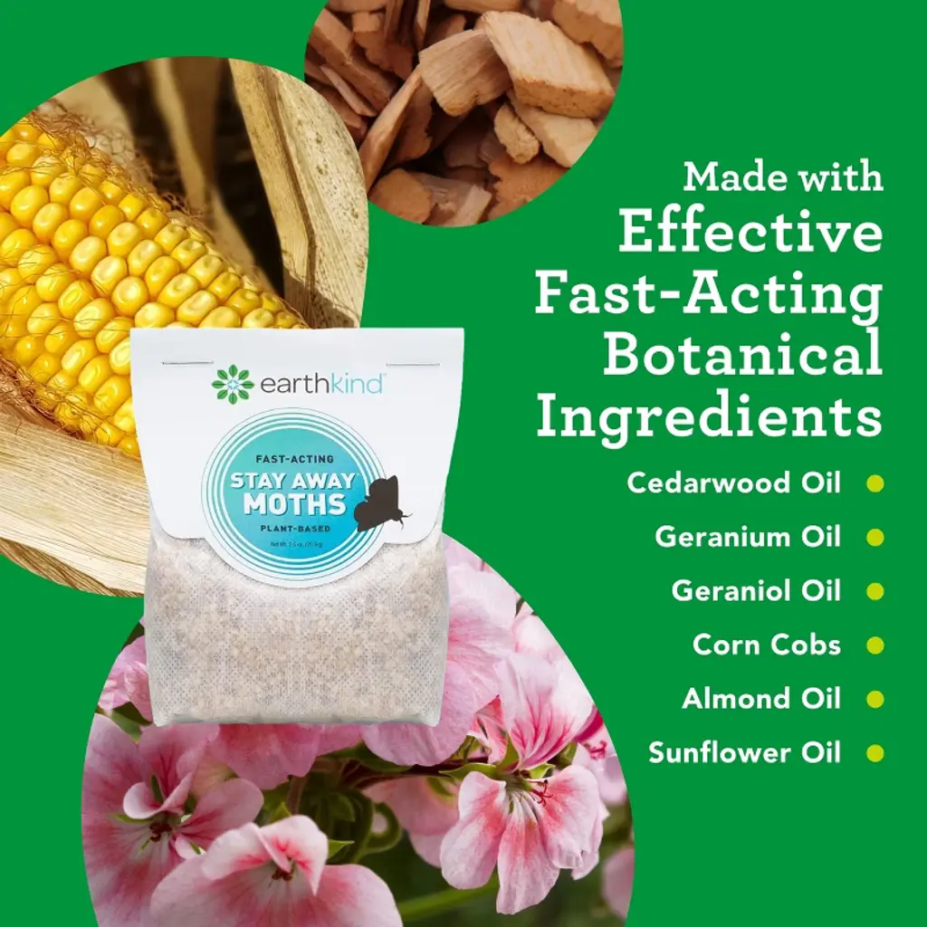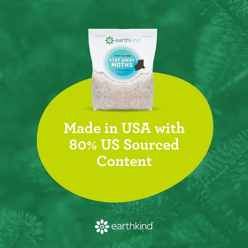 Stay Away Moths Deterrent is a plant-based moth deterrent designed to protect your home from pesky moths. Our pouches are crafted with a mix of essential oils including cedarwood, geranium, and geraniol oil that are blended with corn cobs, almond oil, and sunflower oil. These ingredients work together to deter moths and prevent infestations without negatively affecting the ecosystem. Instead of resorting to traditional poisons or harmful chemicals, Stay Away Moths provides an easy-to-use, DIY pest control solution. Whether you're battling moths in your wardrobe, pantries, closets, or cabinets, Stay Away Moths' versatile pouches can be placed anywhere in your home. Just one pouch per 125 sq ft in areas such as closets, linen closets, and pantries can help keep these pests at bay. For optimal protection, simply increase the number of pouches as needed until you achieve the desired results. Stay Away Moths not only ensures the safety of your home but also respects our shared environment. The product is 100% bio-based, offering a humane alternative to traditional pest control methods. This approach aligns with EarthKind's mission to reduce toxic methods used for pest control and to preserve our natural world. Stay Away Moths is easy to use, even in hard-to-reach areas. Simply place a pouch in your chosen area and replace it when the scent diminishes, usually after 30 to 60 days. For even longer-lasting protection, consider placing each pouch in an EarthKind Pouch Pod. These bio-based, plastic-free pods can make the product last up to three times longer and come with a removable hanger for easy placement. EarthKind is on a mission to make every home a pest-free zone by providing cruelty-free, botanical pest repellent solutions. We create plant-based solutions for keeping pests out of your home without harming them, because we believe in working with nature, not against it.