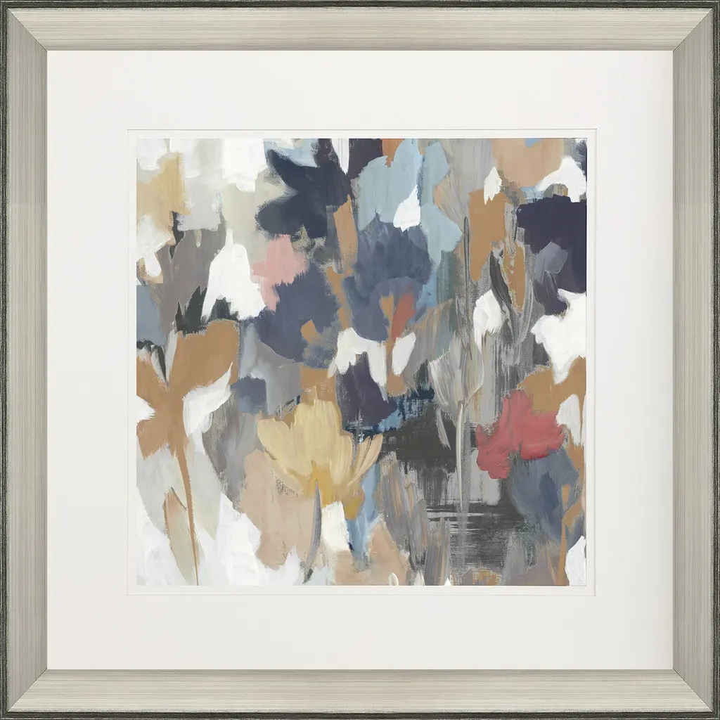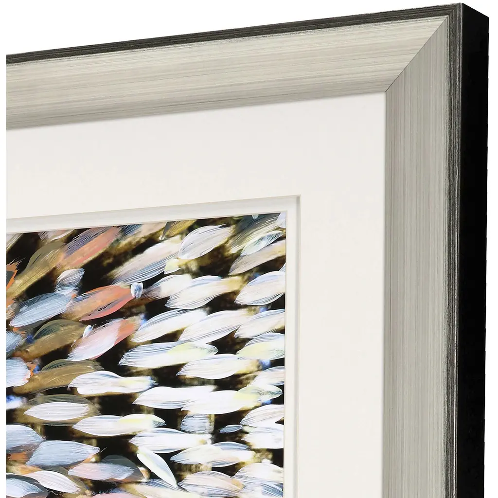 Fractal abstract designs are double matted in white with raised matting. Framed in a modern silver finish molding with black accents.