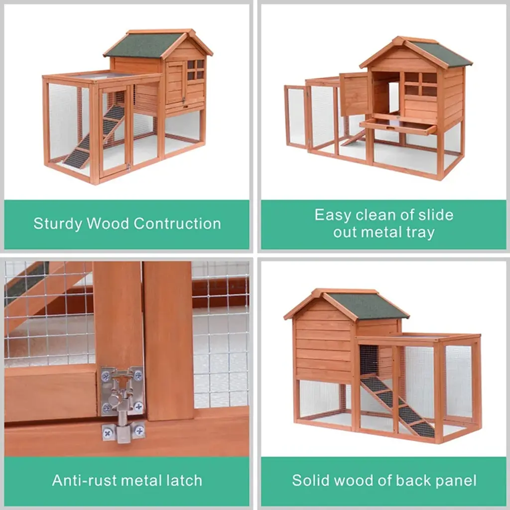 Product FeaturesSpacious Space & Friendly DesignDurable & Weatherproof MaterialSafe & ComfortableEasy to Clean & Wire FencingShipping & Customer ServiceDescription Rabbit Hutch Indoor and Outdoor Bunny Cage 2 Story Pet House Chicken Coop Poultry Cage with Removable No Leakage Tray (Natural Wood) 1. This Mera wooden Bunny Hutch comes with nesting box, resting floor and run floor. The resting house and nesting house are leave the ground to keep warm and dry. There is a sliding door and ramp which is ideal for small animals such as rabbits, guinea pigs,chicks,ducks, pigeons, little bantams,hedgehog, tortoises. 2. The Mera wooden rabbits hutch is made of fir wood and painted with security waterproof non-toxic paint. The original wood is strong, last-long and good for healthy of animals. The cage with paint is waterproof, anti-corrosion and not afraid of sun anymore. The Bunny Hutch will stay in outdoor for years. 3. The small bunny hutch has a large run area with the heavy-duty wire could provide ample room for rabbits to run around and exercise and prevent from being invaded by predators or the neighborhood cat. The resting house made of safe nature wood provides a quiet place for your bunny to relax and hide. 4. There is removable bottom sliding tray of the rabbits hutch for easy cleaning. High quality wire fencing provides a healthy poultry lifestyle. With roof poultry can run outside even in rainy days. The fencing is vital to the ventilation of poultry, it will also protect your animals from outside predators. 5. It will arrivals to your house in 3-6 business days after you placed an order. We packed the products as good as we can, if there is any damaged parts, please feel free to contact us.