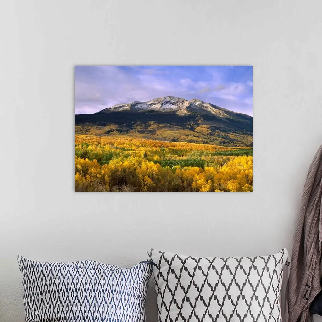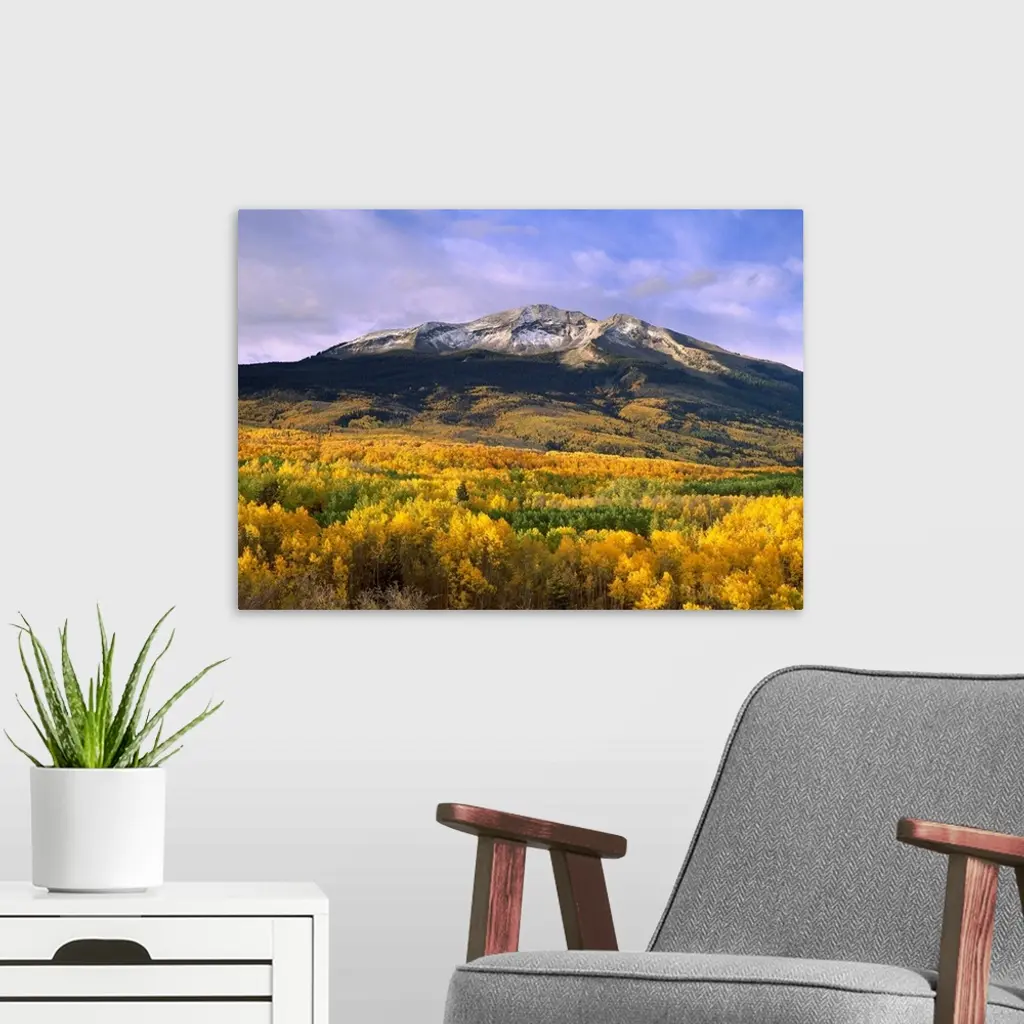 Beautiful nature photograph of East Beckwith Mountain towering above orange and yellow fall trees in the Gunnison nation Forest.