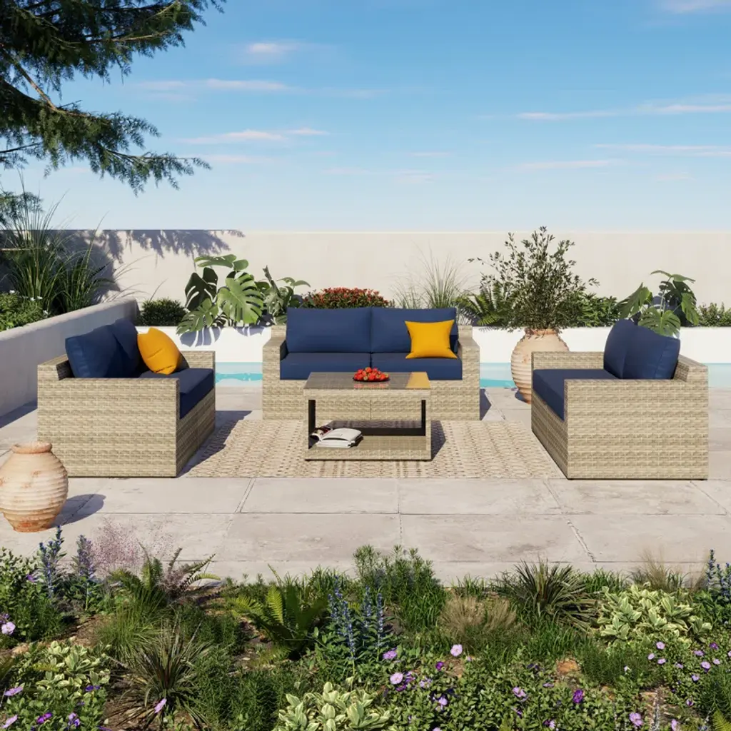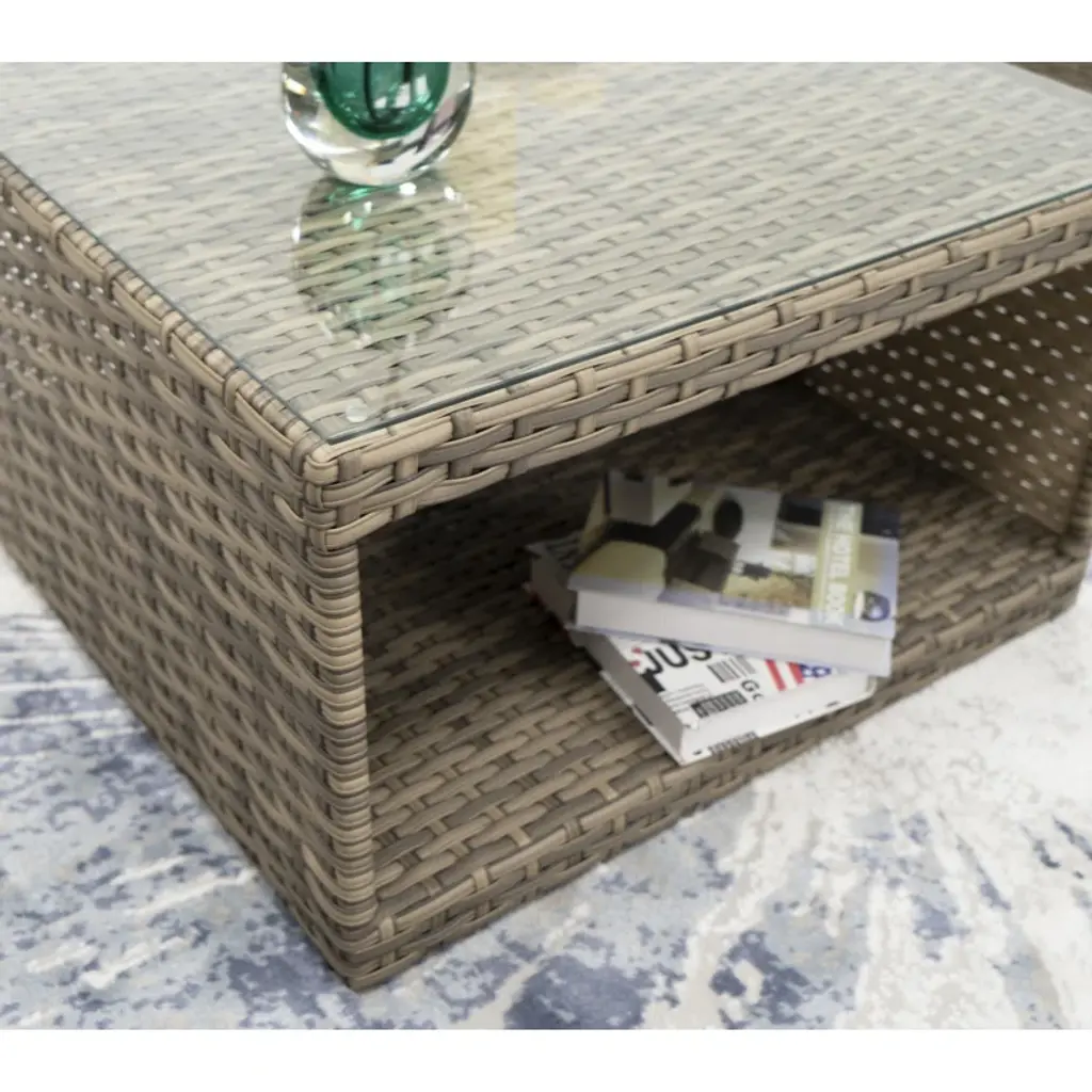 Transform your backyard into an inviting and relaxing hangout spot with a bold 7-piece outdoor conversation set. It includes three modular loveseats and a square table with glass-paneled top and an open shelf underneath for patio essentials. Each piece has an inner aluminum frame that's wrapped in all-weather PE wicker rattan. Water- and UV-resistant, machine-washable olefin seat and back cushions come with this seating group, and they're filled with foam for just the right amount of support as you sit.