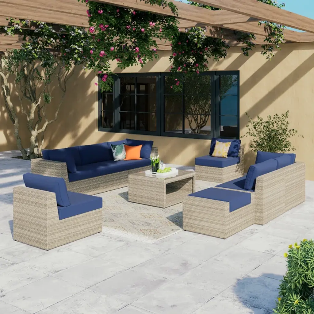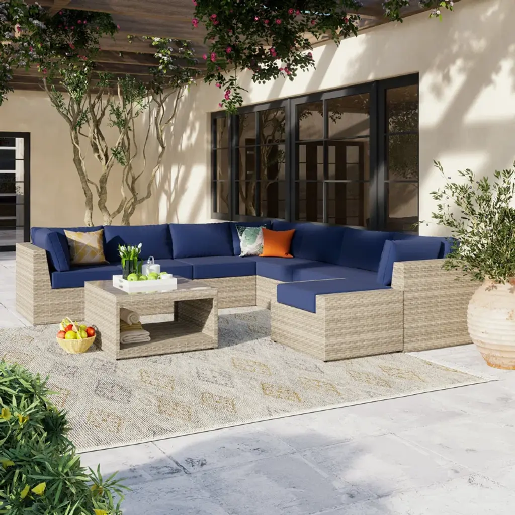Transform your backyard into an inviting and relaxing hangout spot with a bold 9-piece outdoor conversation set. It includes seven modular seats that form a corner sectional, an ottoman, and a square table with a glass-paneled top and an open shelf underneath for all your patio essentials. Each piece has an inner aluminum frame that's wrapped in all-weather PE wicker rattan. Water- and UV-resistant, machine-washable olefin seat and back cushions come with this seating group, and they're filled with foam for just the right amount of support as you sit.