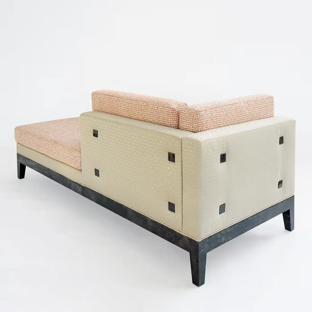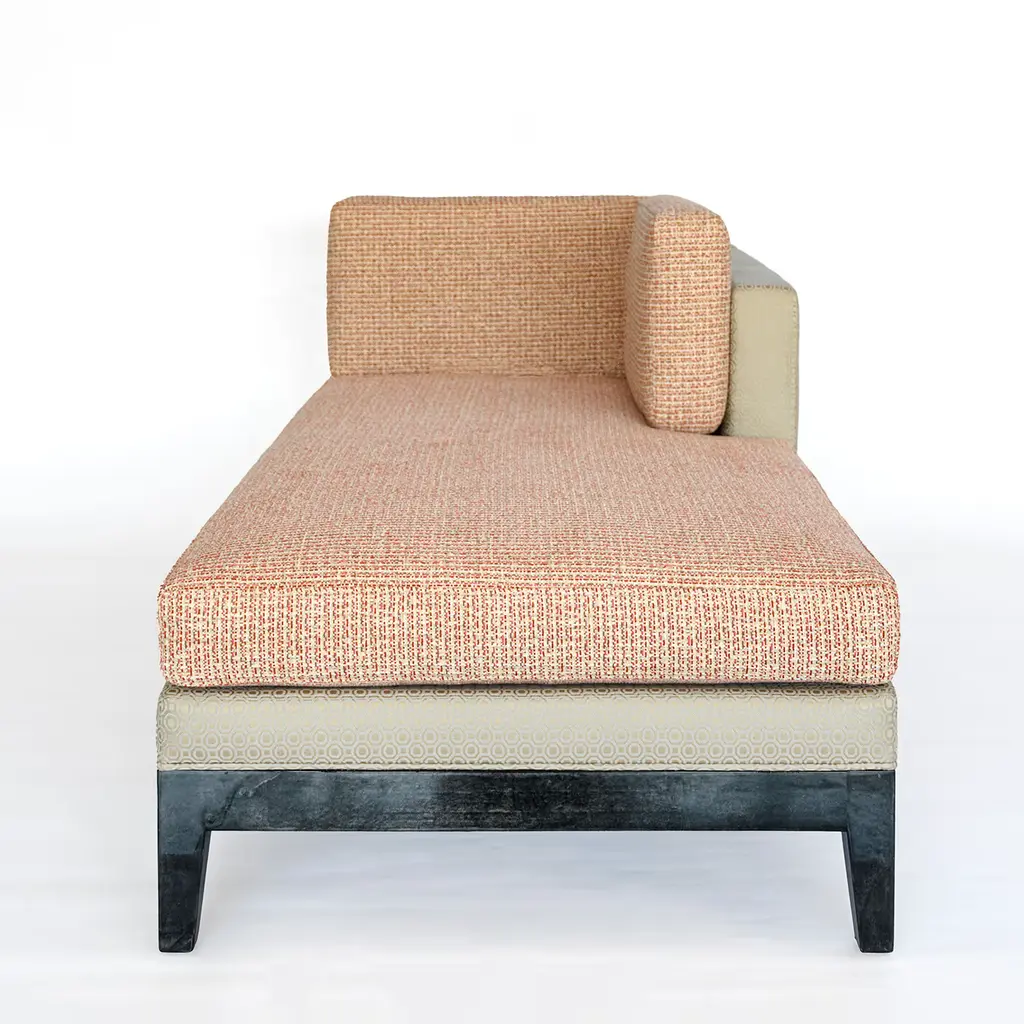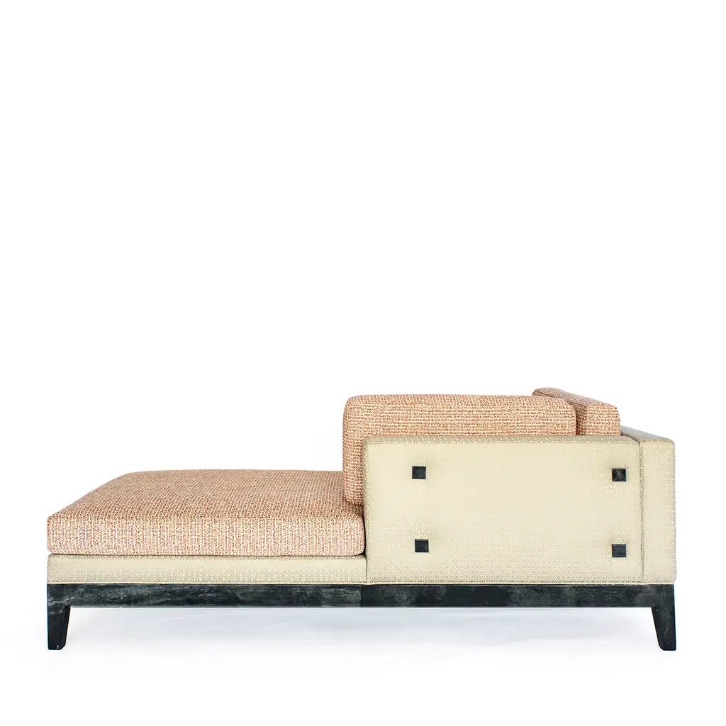Comfortable and elegant dormeuse with wooden base finished with a charcoal grey goatskin and high gloss. Goatskin details are also present on the back cushion. Unholstered with different fabrics, combined with different patterns and textures. Please, ask the Concierge for customization options.
