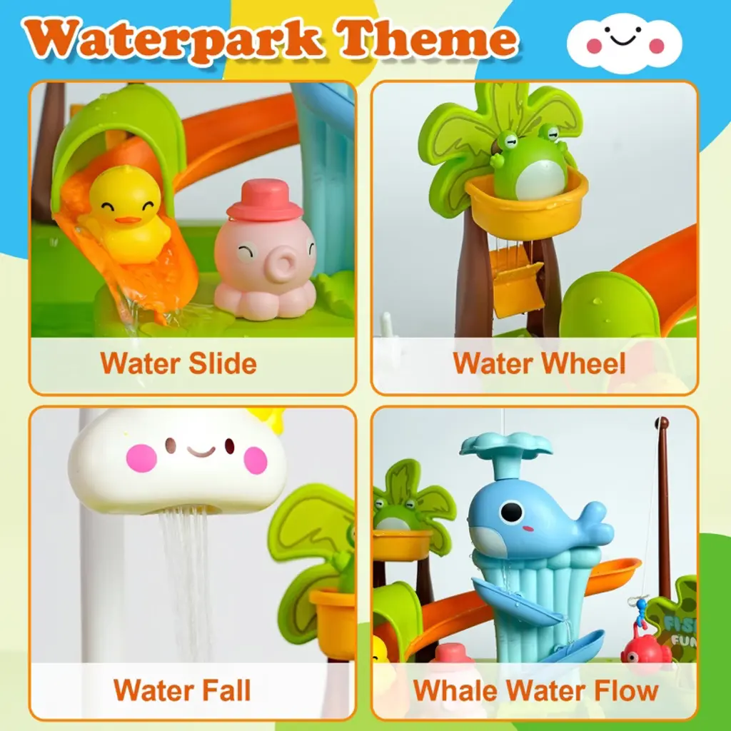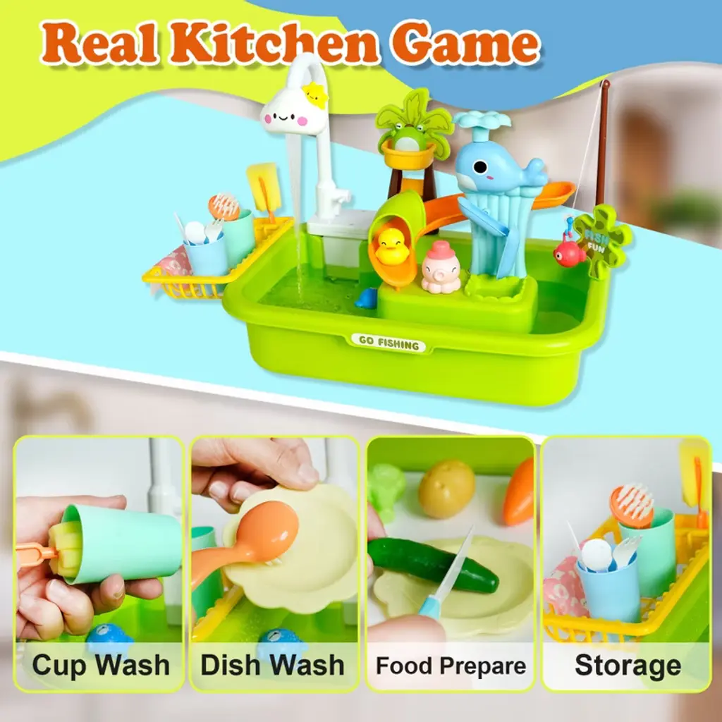 4-IN-1 PLAY SINK - The innovative indoor & outdoor sink for kids, a play kitchen sink with running water that combines fun, education, and safety in one captivating package. It is designed to engage young minds with its four exciting themes: Water Park, Fishing Games, Kitchen Sink, and Bath Toys. It is more than just a toy; it is a comprehensive play experience that stimulates creativity and learning for children. The highlight of this sink toy is its electric faucet, which offers a realistic experience with its automatic water cycle system. Children will be mesmerized by the working faucet water, promoting independent play and motor skills development. This toddler sink toy with running water is designed with rich accessories, including utensils, play food, and fishing tools, providing endless possibilities for imaginative play. Discover the joy of learning through playing with this water sink toy, where education meets excitement. Elevate your child's playtime with this exceptional sink toy for kids, a true testament to creativity and innovation in children's toys. 4 AA batteries required, not included.