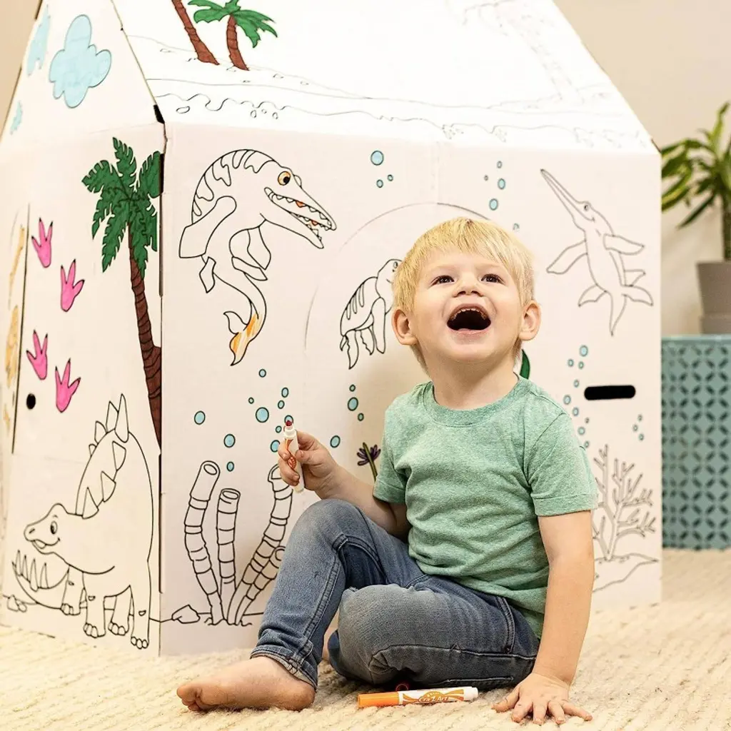 Jump into the Jurassic World with this Dinosaur Playhouse. Discover fossils, explore habitats and customize all of your favorite dinosaurs. With plenty of areas to customize and personalize, they will make it their own. Kids can decorate the house (inside and out! ) with markers, crayons, colored pencils, paint, stickers and more.