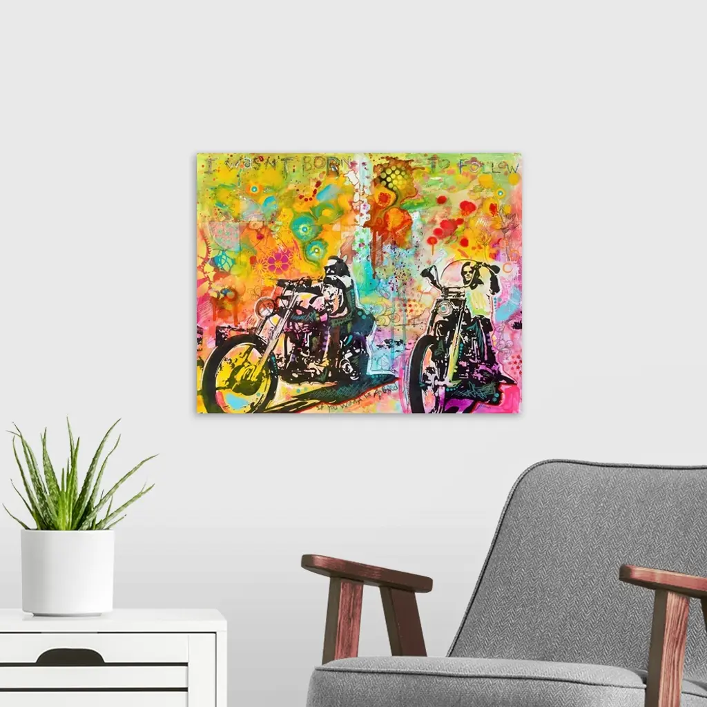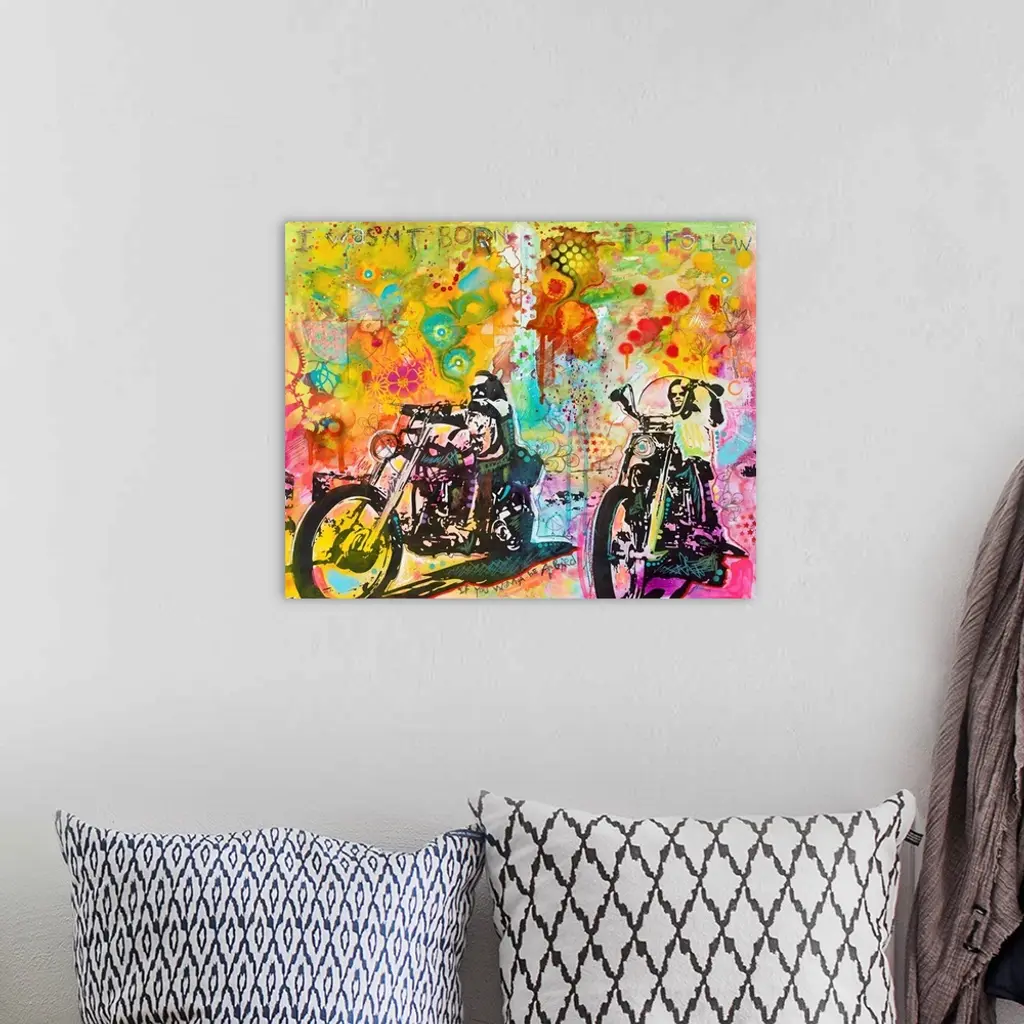 "I Wasn't Born To Follow" hand etched at the top of a colorful illustration of Dennis Hopper and Peter Fonda riding motorcycles from Easy Rider and surrounded by abstract designs.