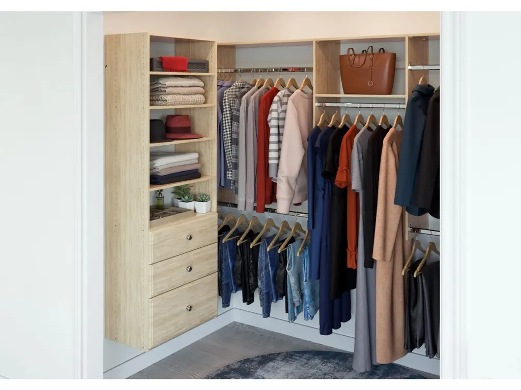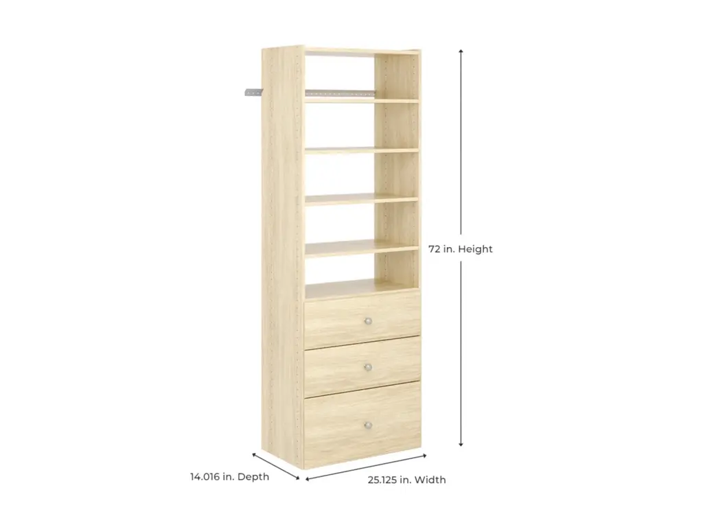 Get organized with the easy to install premier tower closet kit. The kit comes with two 8 in. high drawers and one 12 in. high drawer with included knobs and full extension ball bearing glides. The tower also has 12 Ft. of open shelf space provides plenty of room to store folded clothing, linens, shoes, hats or other items. This closet tower hangs on a wall mounted steel rail for an easy installation. Each kit can be installed on its own or combined with other closet kits and comes with all of the required installation hardware.