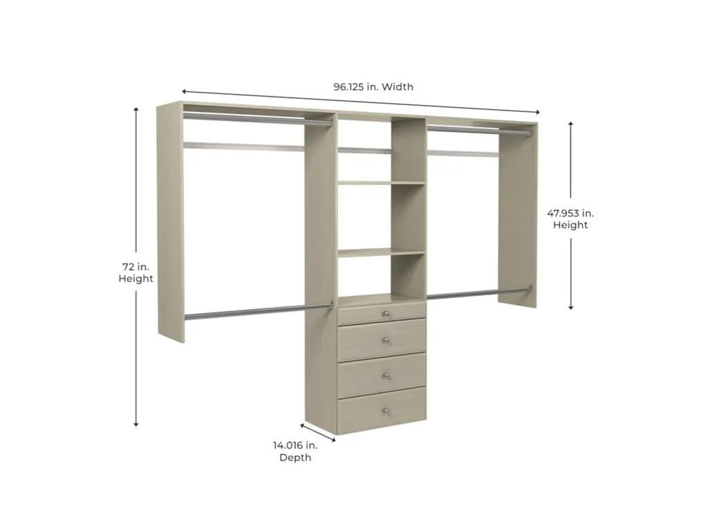Get organized with the easy to install premier closet kit, the most complete closet kit available. This kit includes one 4-in high and three 8-in high drawers as well as almost 14-ft of shelf space and 12-ft of hanging space. This closet system can be cut to fit your desired width and hangs on a wall mounted steel rail for an easy installation. Each kit can be installed on its own or combined with other closet kits and comes with all of the required installation hardware. For any questions regarding this product, please contact customers@thestowcompany.com or 1-800-562-4257 Monday through Friday 8:00AM to 5:00PM (EST)