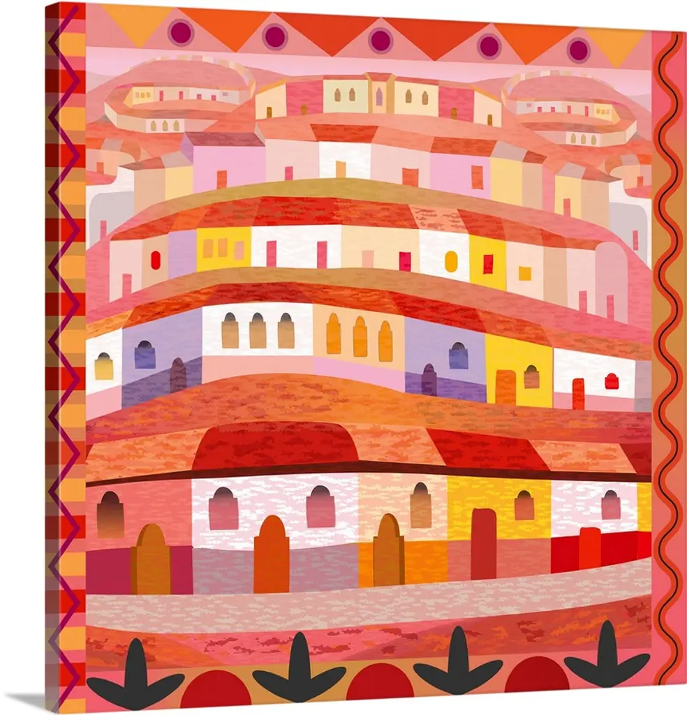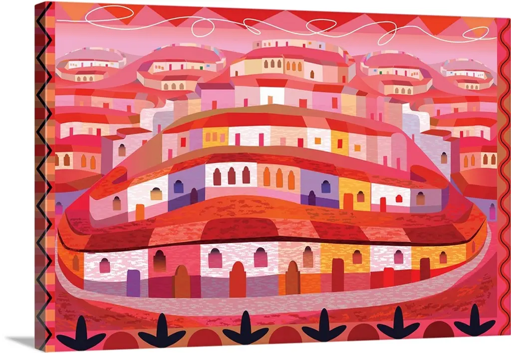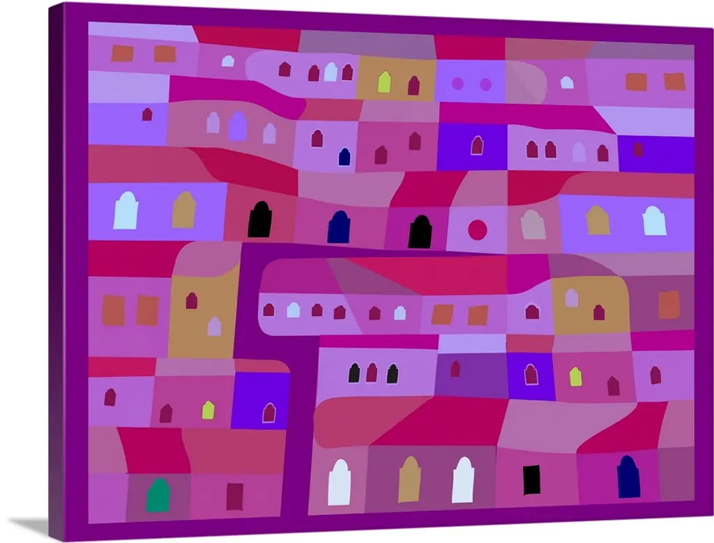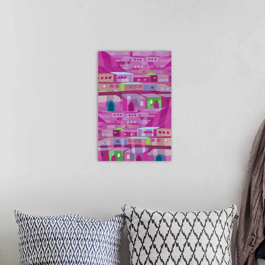 A vertical illustration of rows of houses in various shades of bright pink with accents of green.