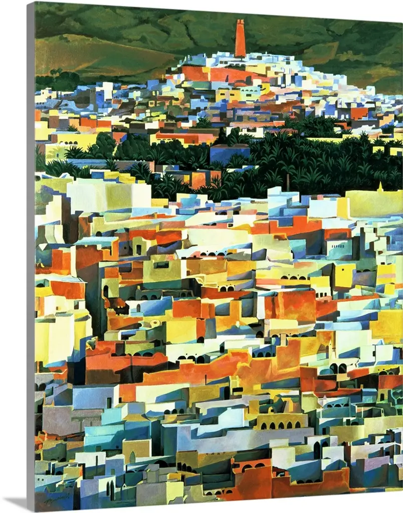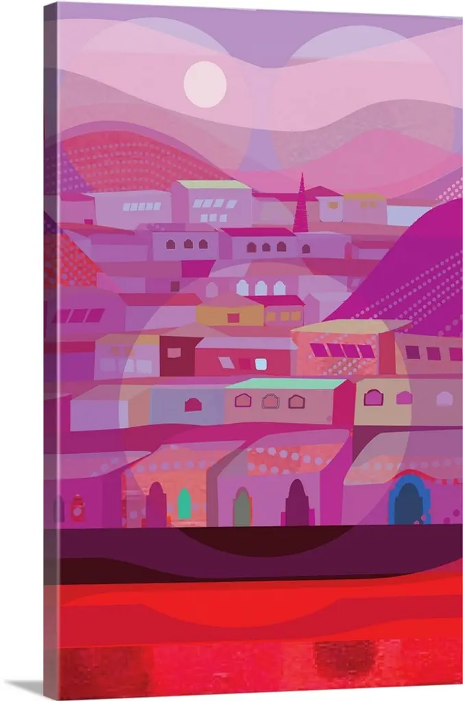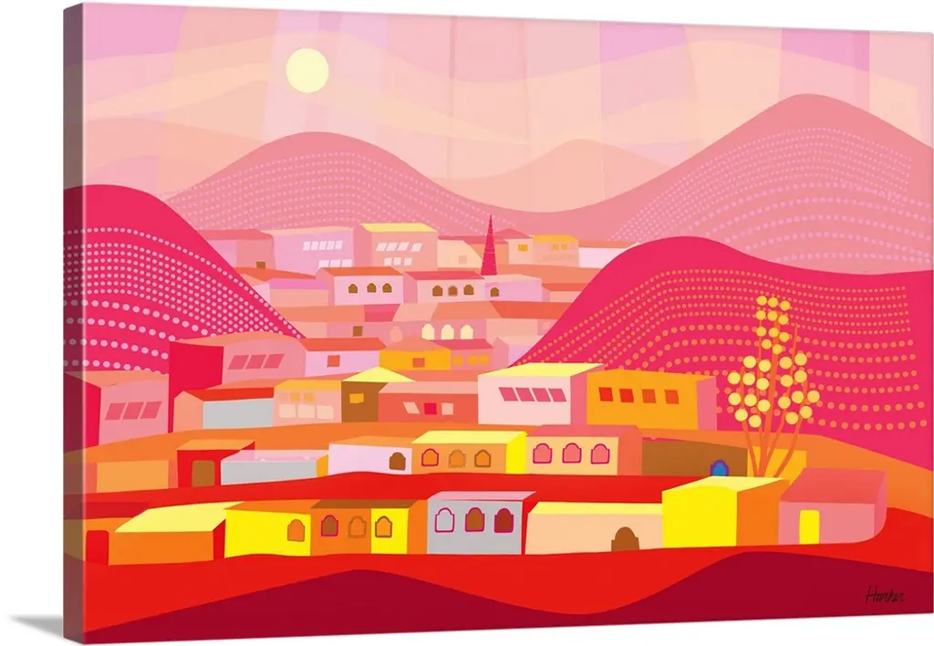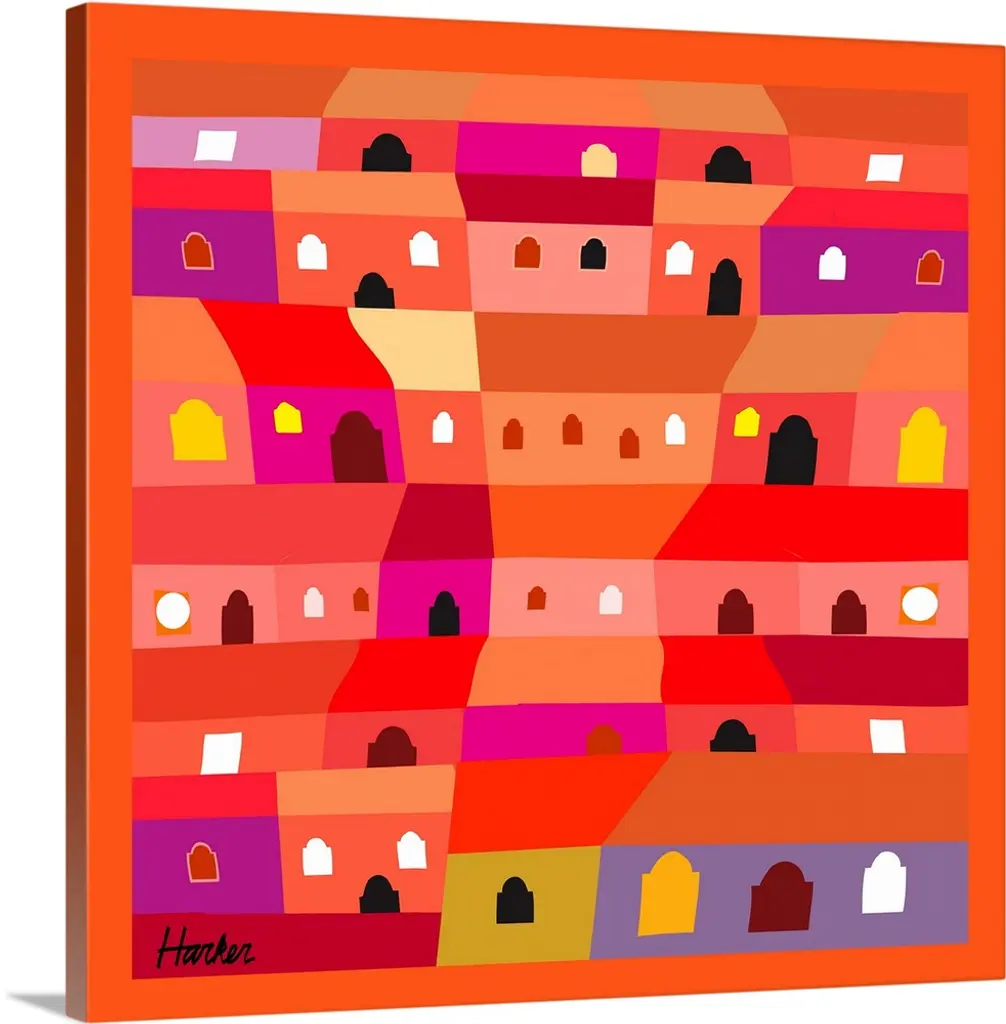 A vertical illustration of rows of houses in various shades of bright pink with accents of green.
