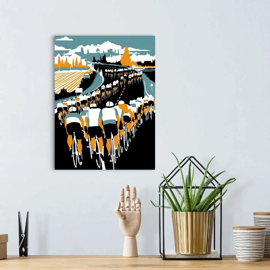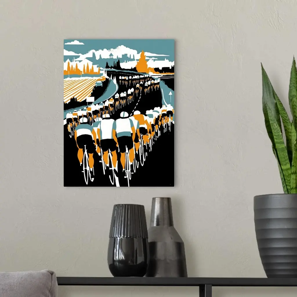 Contemporary illustration of a cycling race through a countryside.