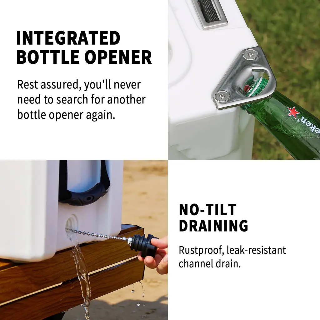 Experience the multifunctionality of our rotomolded cooler, where its rugged design transforms into an additional seat or a sturdy table, offering versatility for your outdoor activities. With a remarkable weight capacity of up to 350 lbs, it ensures reliable support for various needs. The thoughtful addition of a convenient chain ensures that the drain plug cap is always within reach during the drainage process, making post-journey cleanup a seamless and enjoyable task. Elevate your outdoor experiences with a cooler designed for both durability and practicality.