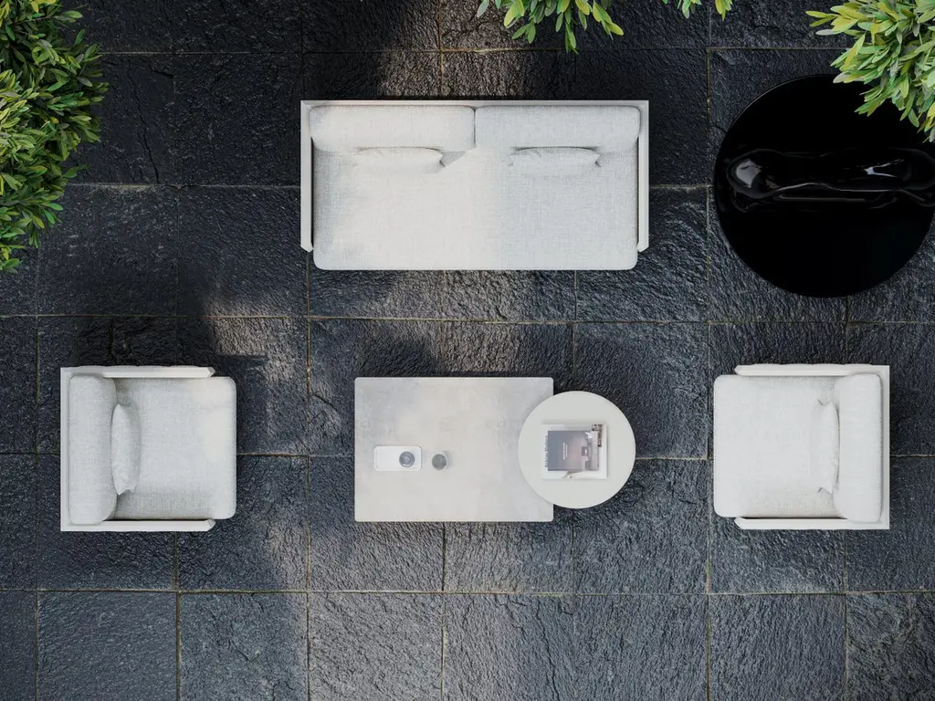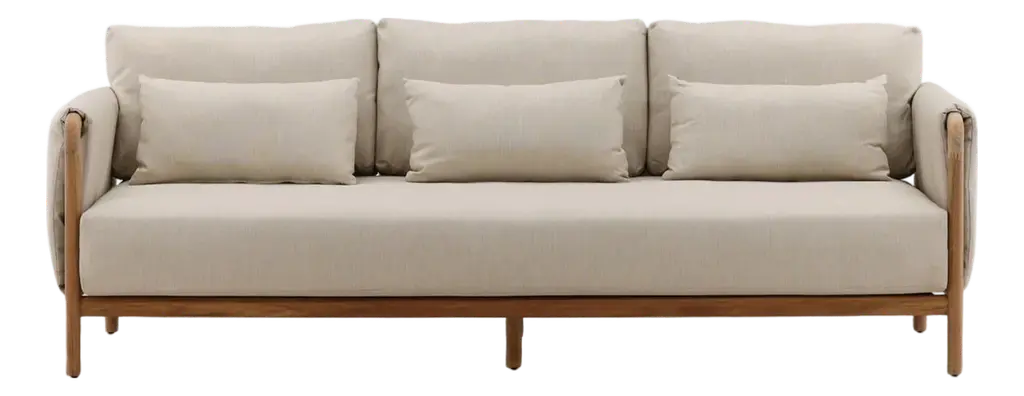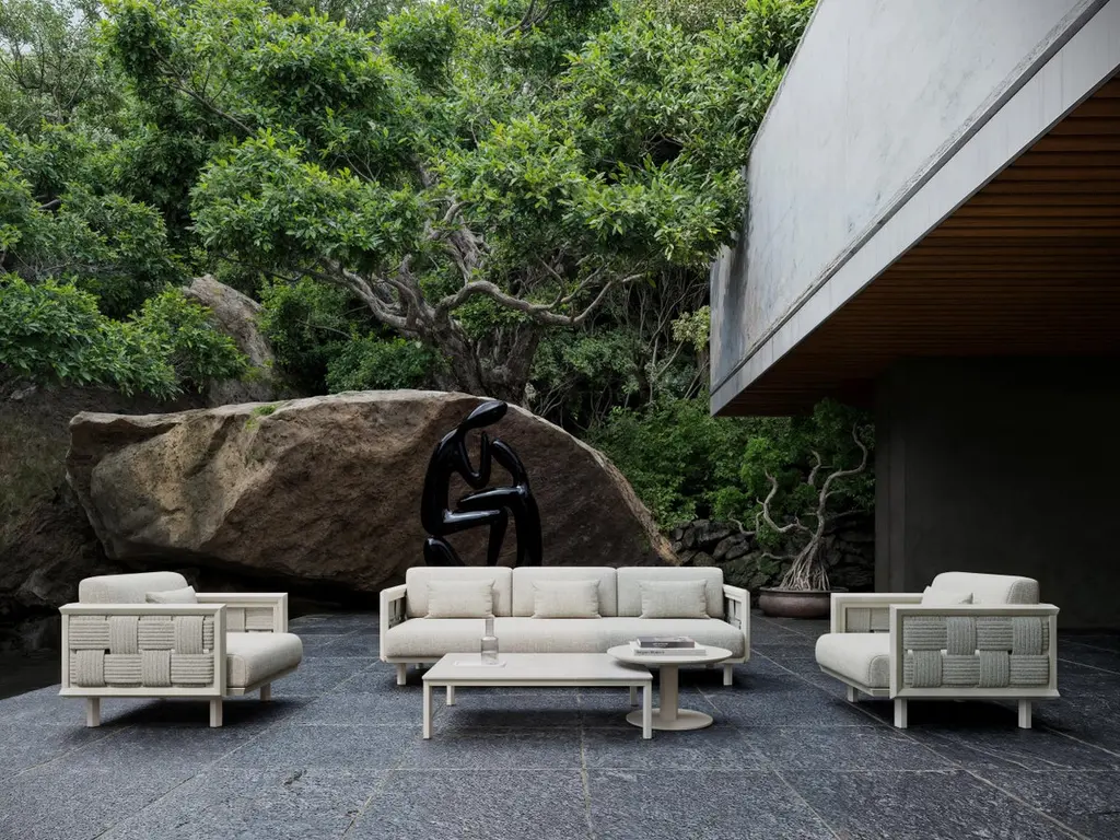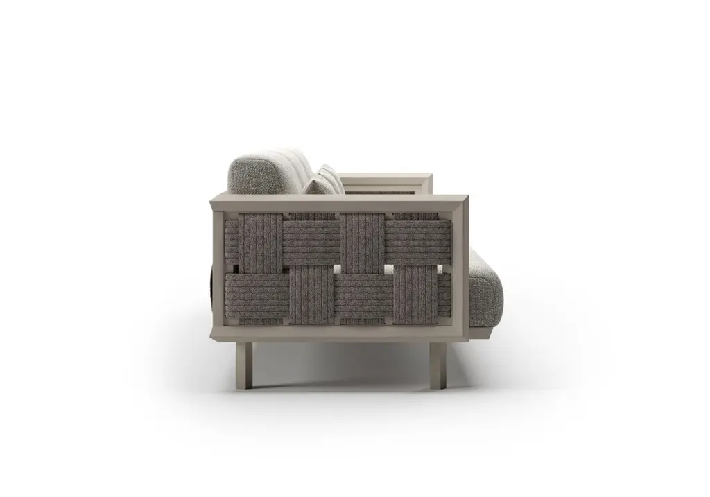 Éclat-Bisque Rope, Luminesce Fabric And Aluminum Three-Seater Sofa by SNOCDimensions: D 93,5 x W 240 x H 67 cm. SH: 39 cm.Materials: Aluminium, rope, and Luminesce fabric. Anthony Spon-Smith, a visionary in modern design, creates furniture that transcends traditional boundaries. In the Éclat Collection, he showcases his mastery in seamlessly blending form and function. Each piece, constructed with an aluminum frame and rope, achieves a perfect balance of strength and elegance. This combination not only produces visually stunningdesigns but also ensures durability and comfort. Spon-Smith’s design philosophy is deeply rooted in a profound understanding of the spaces his creations will inhabit. This collection is meticulously crafted to elevate environments, making them both inviting and refined.SnocSince their foundation in 2004, SNOC’s history has been interwoven with that of international design. Each chapter written with care, each product reflecting its passion. The company understands that a real story exists behind each object and behind that story, a real person desiring something more. Their ever-developing methodology focuses on defining the core of a brand and utilizing those characteristics to help nurture its soul, aiding in forging real connections. This approach , results in their unique “work in progress” style: original, versatile solutions that in their signature blend of sound, vision and design best-suit every environment and situation, arousing a range of emotions on a daily basis as well as standing the test of time.Driven by functional research, an inclusive project and product culture, and deep care for the environment, we exist as the timeless yet present essence of outdoor furniture design elevating private and public space a like with thoughtfully presented, endlessly adaptive creations.