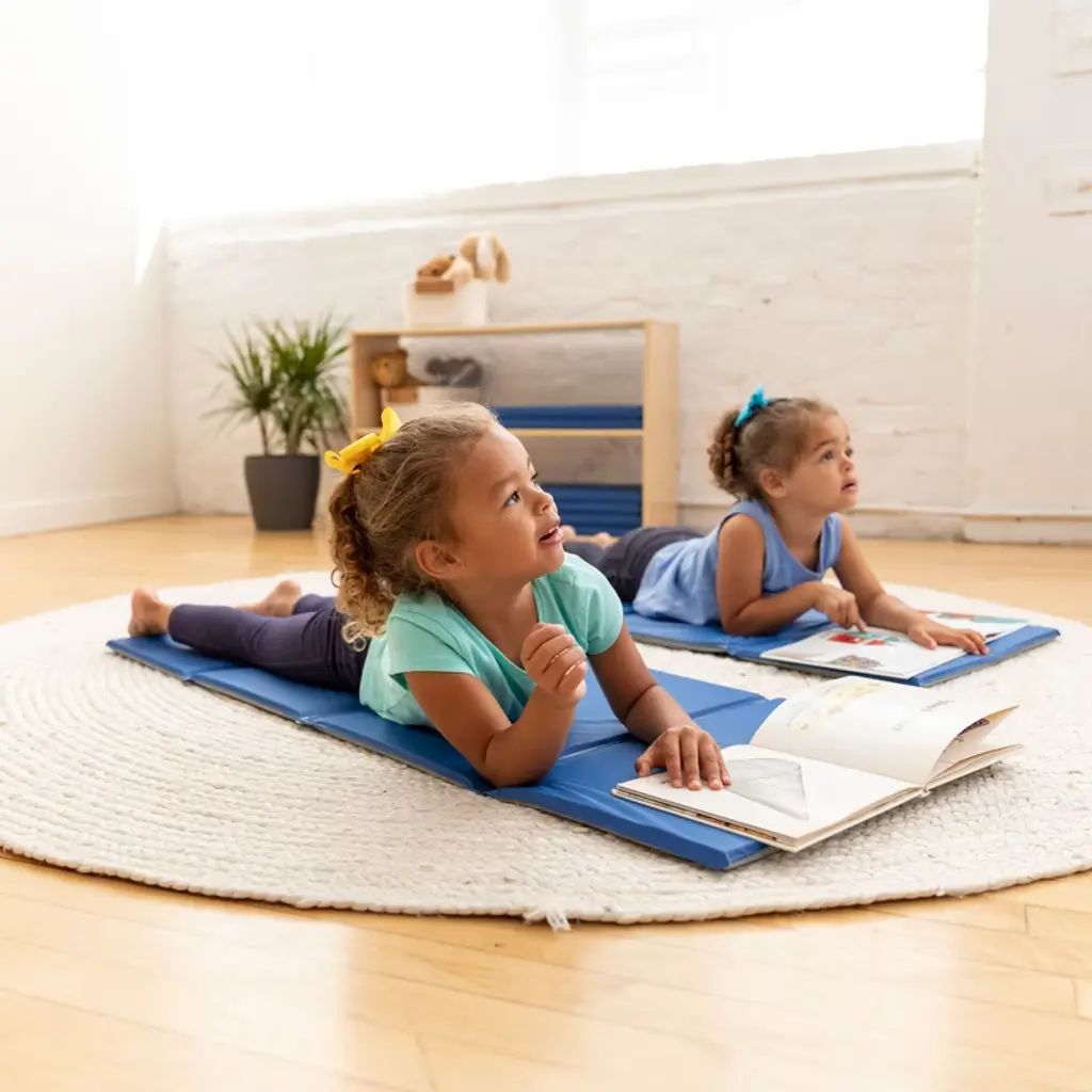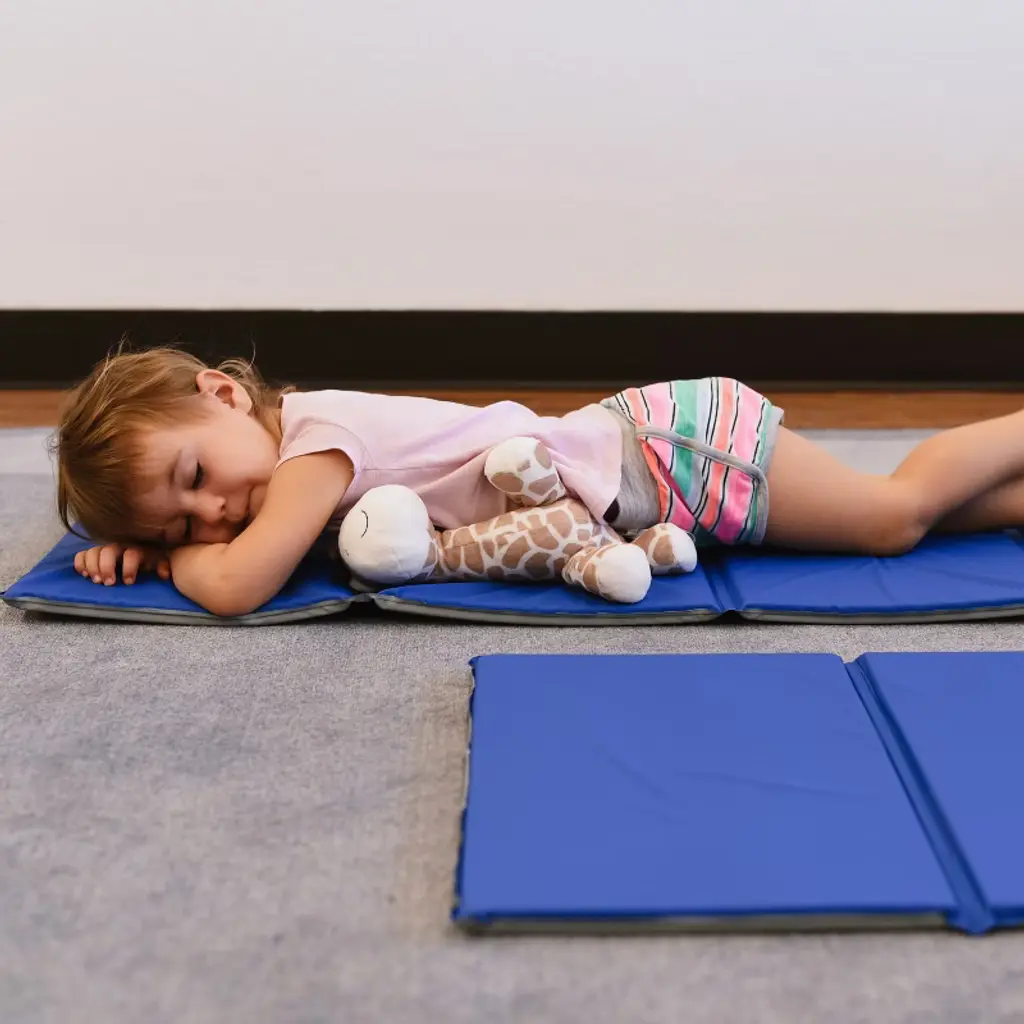 Everyday Folding Rest Mats are the perfect place for little ones to rest and relax when nap time happens away from home. Daily routines can offer the sense of security and consistency for little ones, creating an environment of relaxation that helps to release the tension of the day. The transition to nap time teaches children self-esteem and independence as they carry out these familiar routines and take a break from the day’s activities. Children can get their own bedding and place it on their mat. Sleep plays an important role in childhood brain development and children nap best when they have their own space to fall asleep. For those that don’t sleep, quiet time helps children refresh for more focused learning. Children who don’t sleep also become skilled at being respectful of those who need quiet time. When naptime is over, simply fold mats in four for compact storage. The accordion style folding design keeps the "sleep side" separate from the "floor side". Designed for everyday use in daycares, preschools, and early learning environments. Pair classroom nap mats with ECR4Kids Rest Time accessories including sheets, blankets, and Nap Mat Companions with pillows, sold separately.