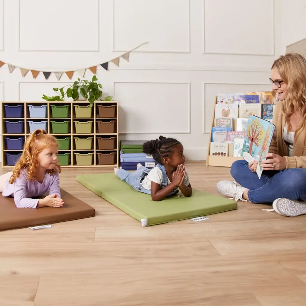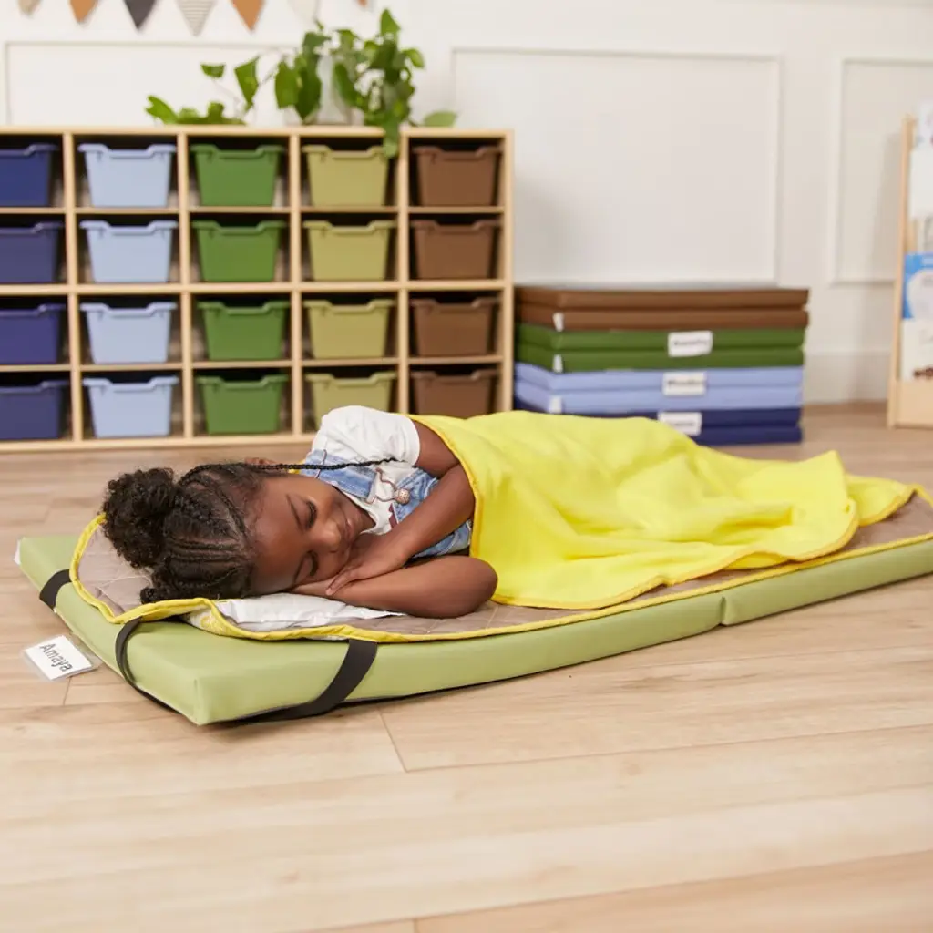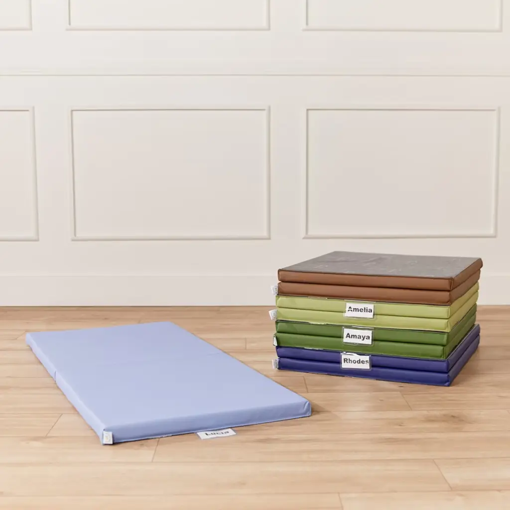 Create a calm environment for little ones to relax with SoftZone Folding Rainbow Rest Mats. This set of five foldable rest mats allow you to create a smooth transition into nap time in home daycares, classrooms, and early childhood facilities. Kids can identify individual mats using the sewn-in name tag, promoting confidence and teaching children about taking responsibility for personal belongings. Teachers and caregivers can maintain a clean and consistent sleeping environment by keeping the colorful "sleep side" separate from the "floor side”. When nap time is over, the lightweight 2-fold mats easily stack to save valuable classroom space. The comfy sleep pad is the perfect place for children to snuggle up, relax, and rest. Sleep plays an important role in childhood brain development, and daily rest time helps children process new information and restore energy levels. The foam core is covered with water-resistant polyurethane vegan leather with a durable woven backing and features a non-slip base for added stability. Fully stitched seams and soft edges make these mats safe for children. The cozy toddler sleeping pads can be paired with rest time accessories including ECR4Kids blankets, nap mat companions, and privacy partitions, sold separately.