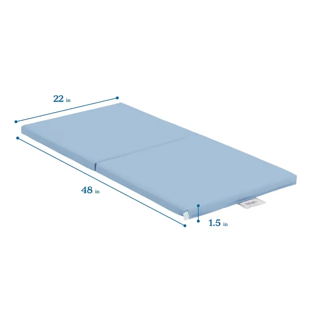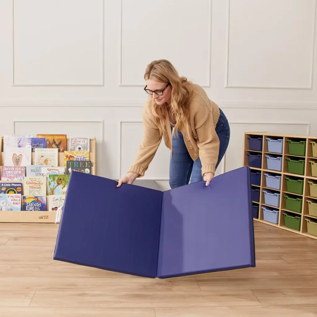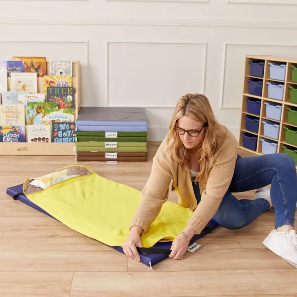 Create a calm environment for little ones to relax with SoftZone Folding Rainbow Rest Mats. This set of five foldable rest mats allow you to create a smooth transition into nap time in home daycares, classrooms, and early childhood facilities. Kids can identify individual mats using the sewn-in name tag, promoting confidence and teaching children about taking responsibility for personal belongings. Teachers and caregivers can maintain a clean and consistent sleeping environment by keeping the colorful "sleep side" separate from the "floor side”. When nap time is over, the lightweight 2-fold mats easily stack to save valuable classroom space. The comfy sleep pad is the perfect place for children to snuggle up, relax, and rest. Sleep plays an important role in childhood brain development, and daily rest time helps children process new information and restore energy levels. The foam core is covered with water-resistant polyurethane vegan leather with a durable woven backing and features a non-slip base for added stability. Fully stitched seams and soft edges make these mats safe for children. The cozy toddler sleeping pads can be paired with rest time accessories including ECR4Kids blankets, nap mat companions, and privacy partitions, sold separately.
