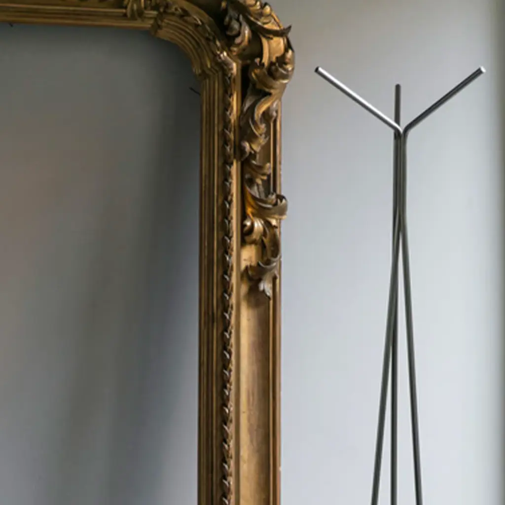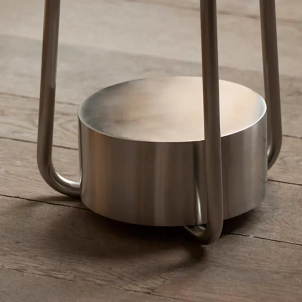 A timeless and versatile piece of functional design, this coat hanger is entirely crafted of steel, showcasing a natural steel finish. Its minimalist and inventive silhuette is composed of a carved circular base, and three long vertical stems bent at the top.