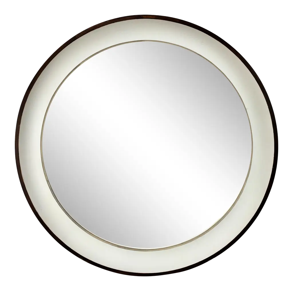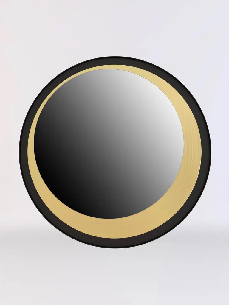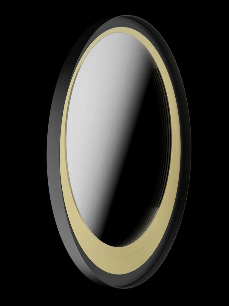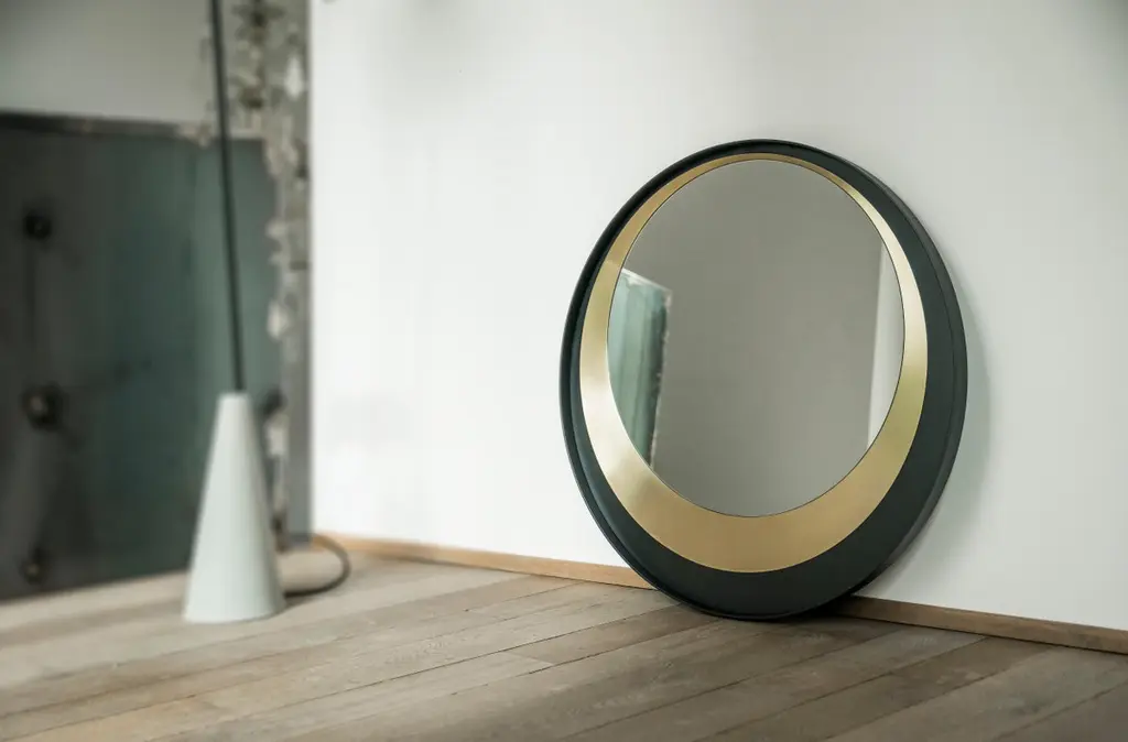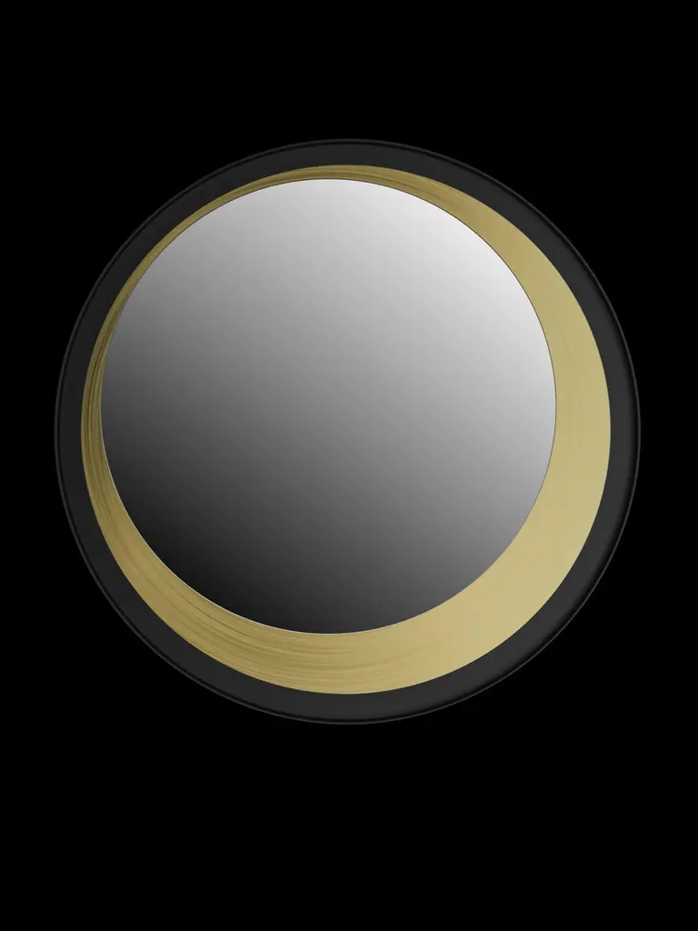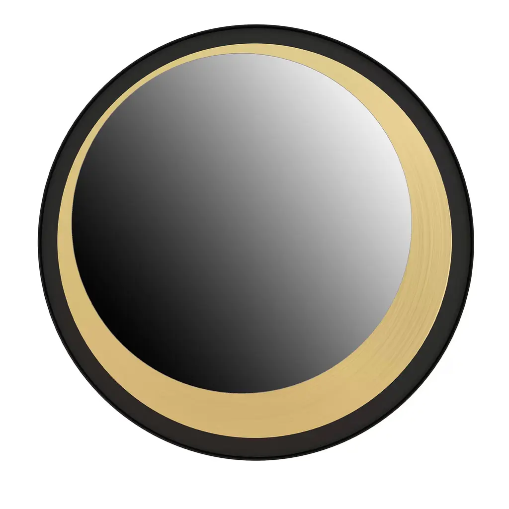 Wall mirror with black paint and brushed brass structure.The mirror is provided with four hanging points, allowing the mirror itself to be mounted in four different positions.