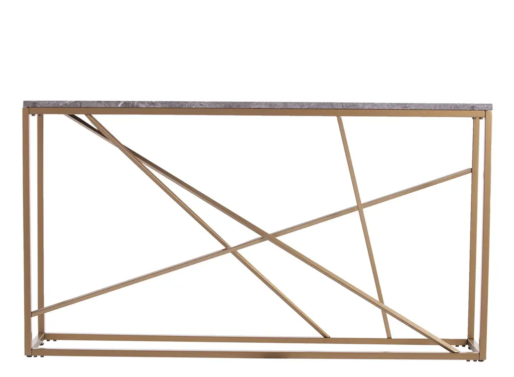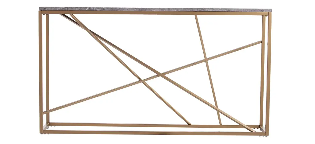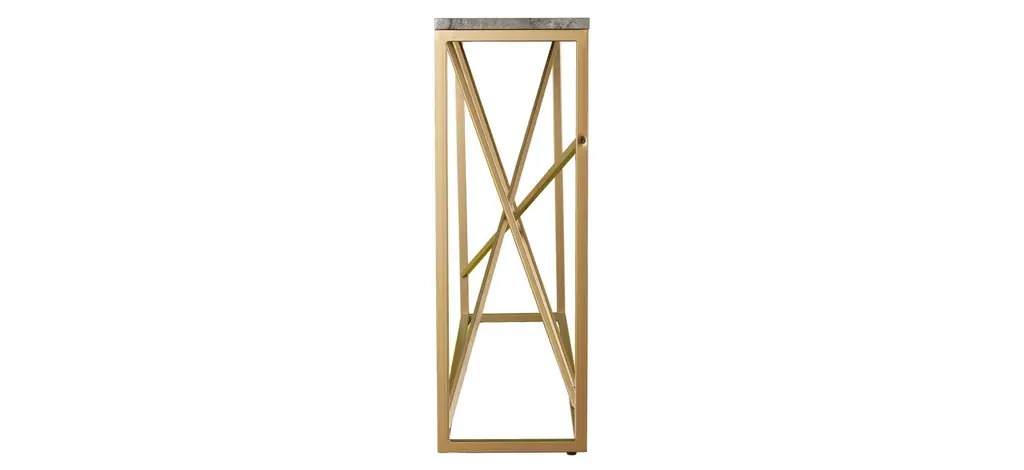 Create a style manifesto with this Edenbridge Faux Stone Console Table. Gold metal contrasts with gray faux stone, creating a sleek, mixed media look. Skinny console keeps a slim profile in the family room under your wall mounted TV or as a space savingvalet table in your entry way. Place your favorite travel photos, statues, or flowers on top, and quickly design an eye catching, multifunctional focal point.
