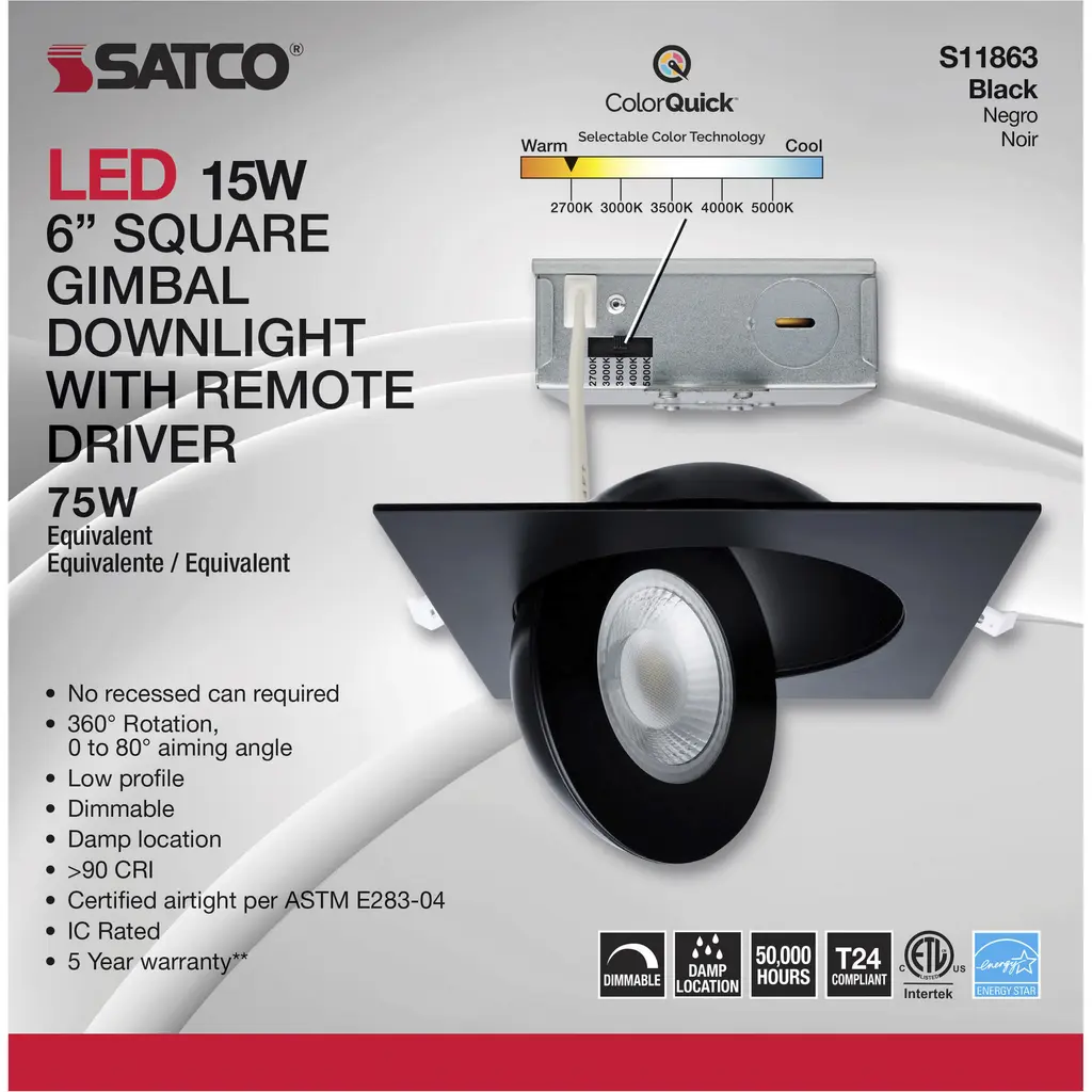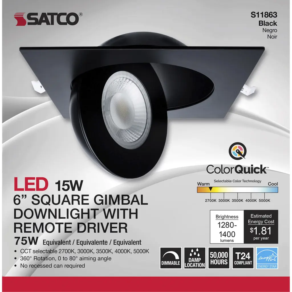 15 Watt; CCT Selectable; LED Direct Wire Downlight; Gimbaled; 6 Inch Square; Remote Driver; Black