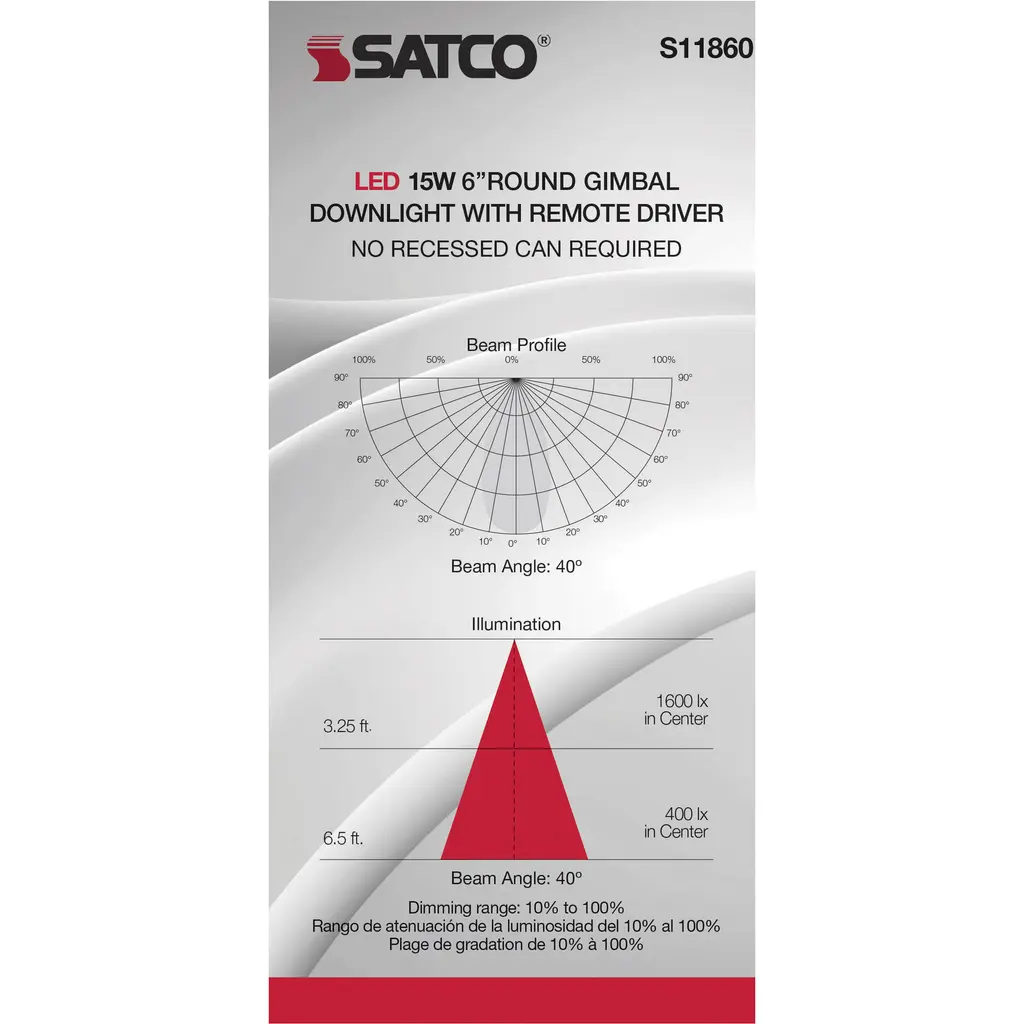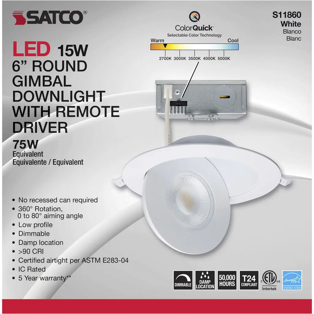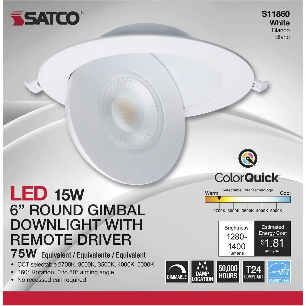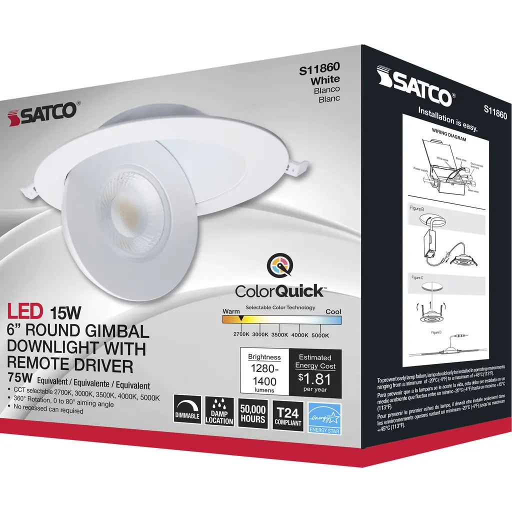 15 Watt; CCT Selectable; LED Direct Wire Downlight; Gimbaled; 6 Inch Round; Remote Driver; White