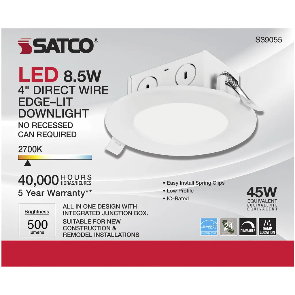 8.5 watt LED Direct Wire Downlight; Edge-lit; 4 inch; 2700K; 120 volt; Dimmable