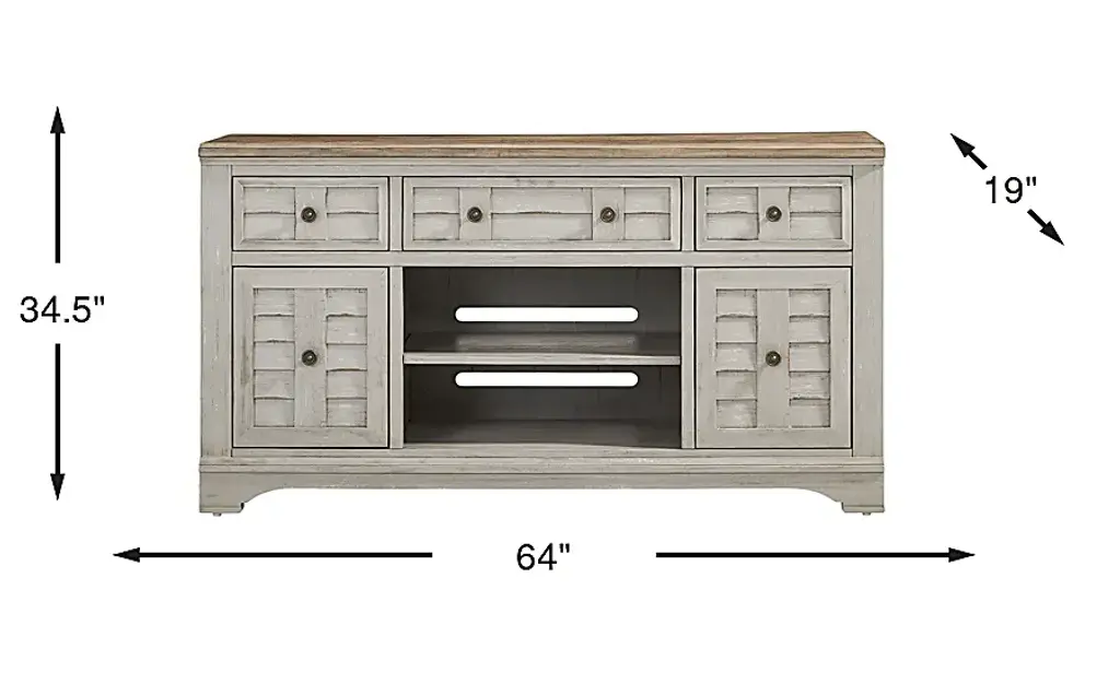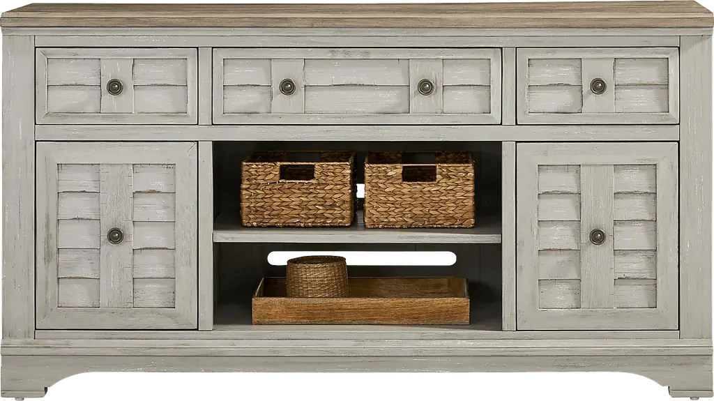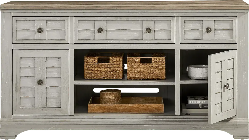 This console features an open shelving system, complete with discreet wire management to keep cords tucked neatly out of sight. The paneled cabinet doors and drawers are designed to conceal everyday essentials with ease, lending the piece both practicality and polish. The look wouldn't be complete without the body's rich mahogany veneer work and the top's natural pine veneer, a pairing that brings depth, contrast and harmony to the design. Soft gray finish offers the perfect final touch, brightening the console with breezy charm.
