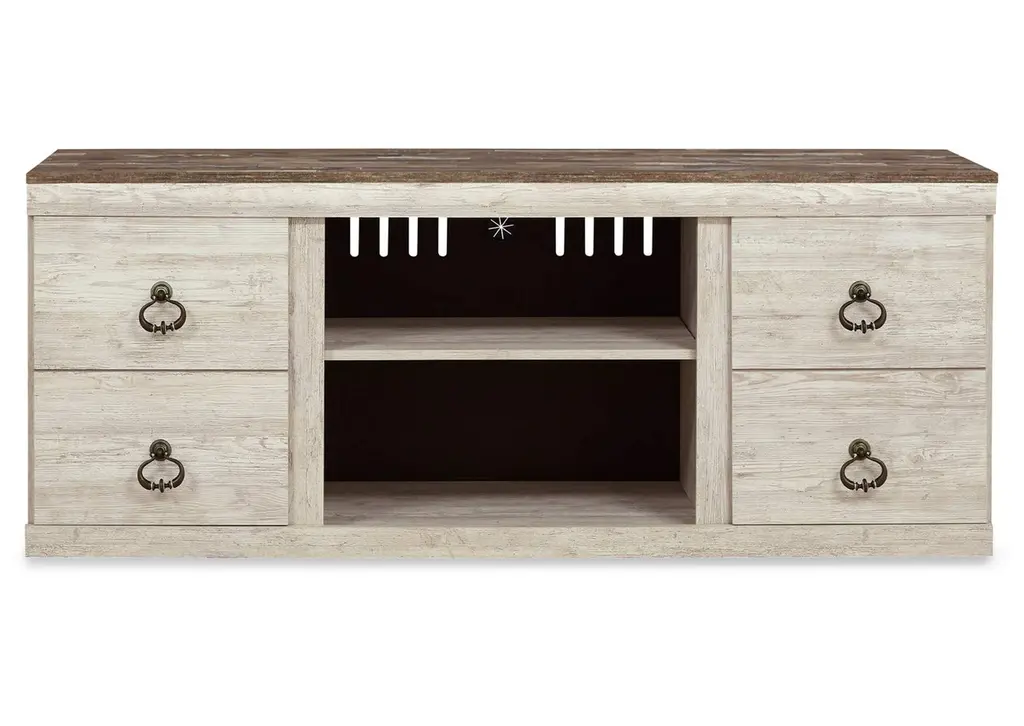 This console features an open shelving system, complete with discreet wire management to keep cords tucked neatly out of sight. The paneled cabinet doors and drawers are designed to conceal everyday essentials with ease, lending the piece both practicality and polish. The look wouldn't be complete without the body's rich mahogany veneer work and the top's natural pine veneer, a pairing that brings depth, contrast and harmony to the design. Soft gray finish offers the perfect final touch, brightening the console with breezy charm.