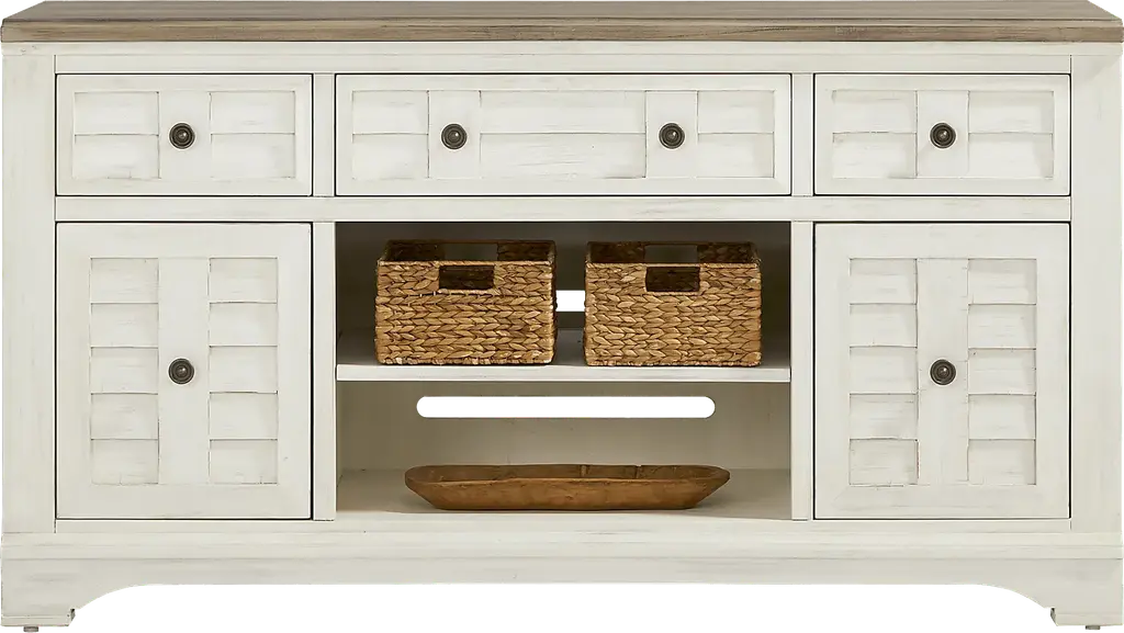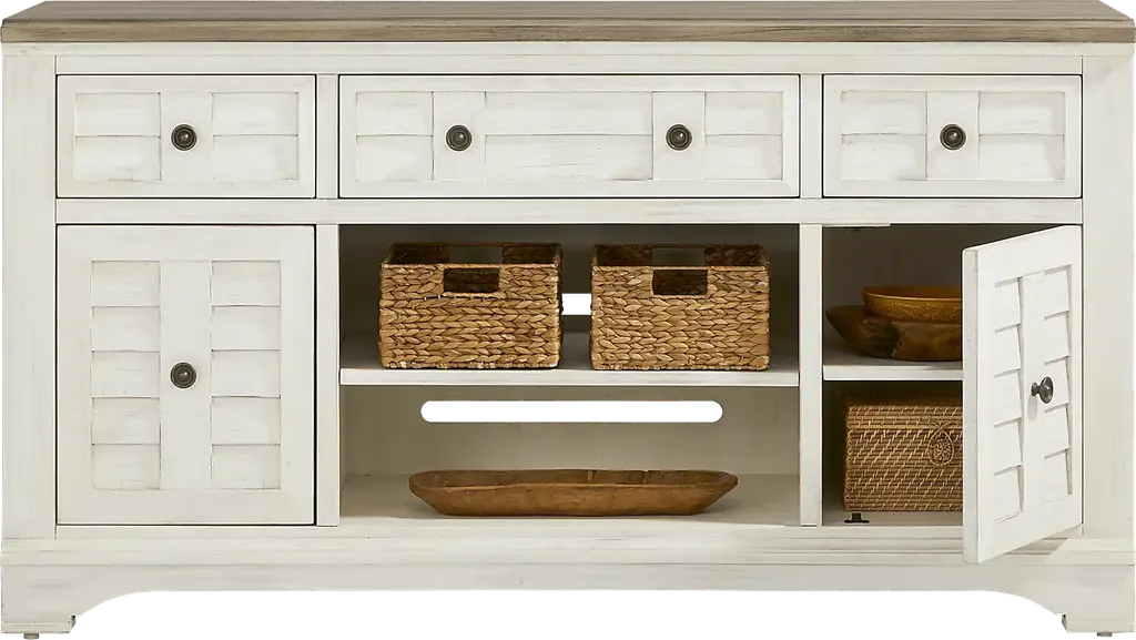 This console features an open shelving system, complete with discreet wire management to keep cords tucked neatly out of sight. The paneled cabinet doors and drawers are designed to conceal everyday essentials with ease, lending the piece both practicality and polish. The look wouldn't be complete without the body's rich mahogany veneer work and the top's natural pine veneer, a pairing that brings depth, contrast and harmony to the design. Crisp white finish offers the perfect final touch, brightening the console with breezy charm.