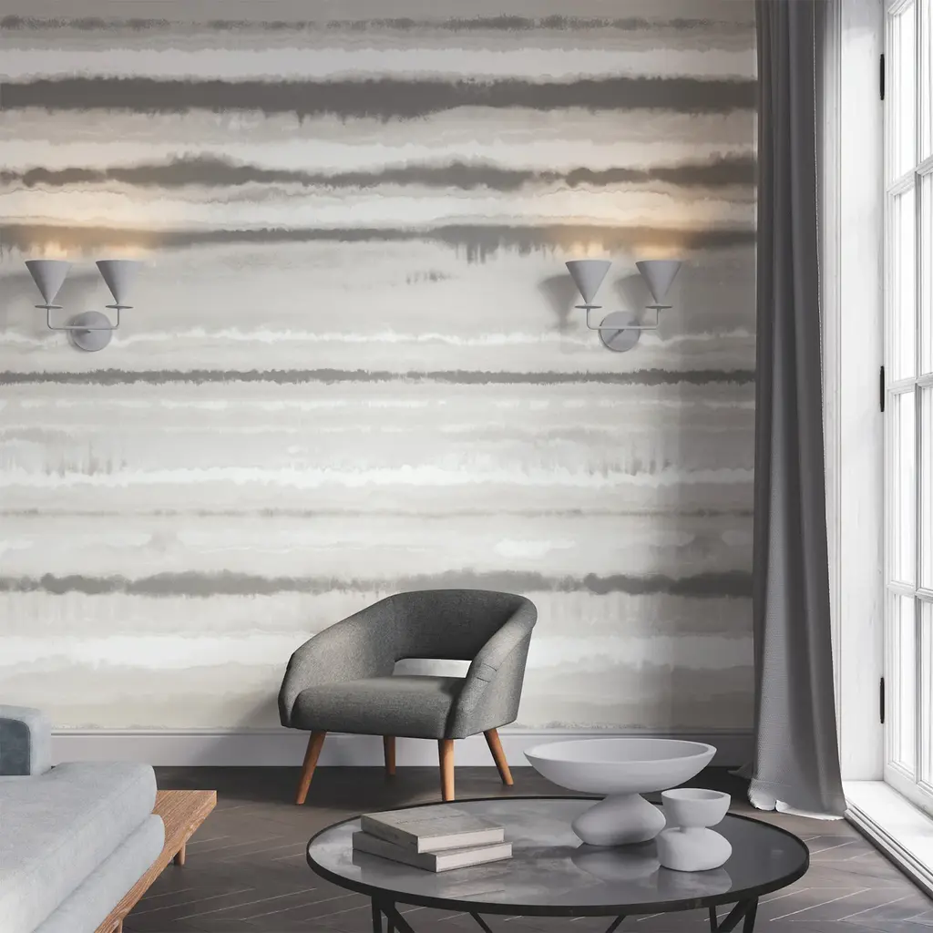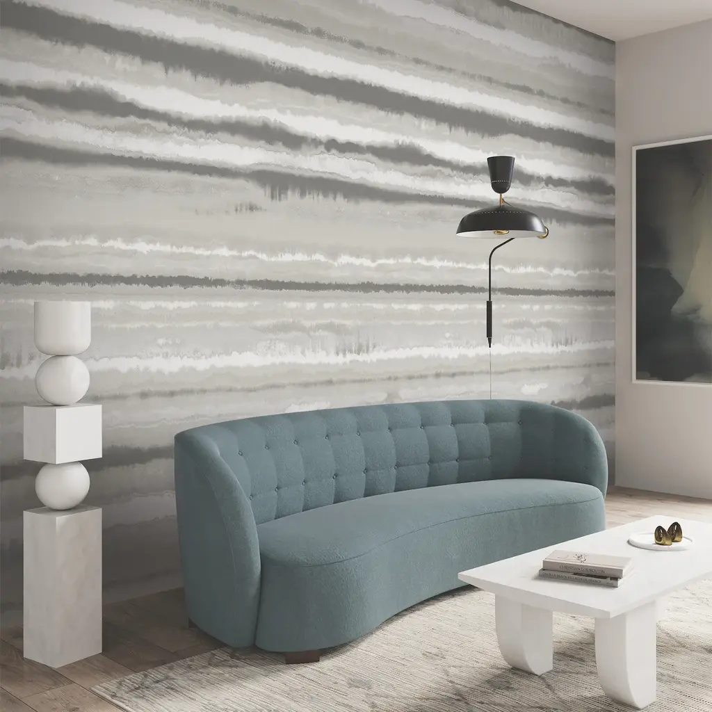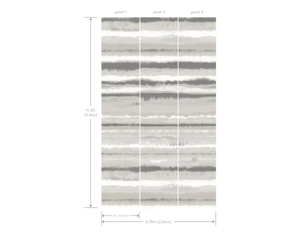 The horizontal painterly brushstrokes of Edition Mural are a soft abstract interpretation of healing ocean waters and rolling waves,shown in misty gry and beige neutrals.