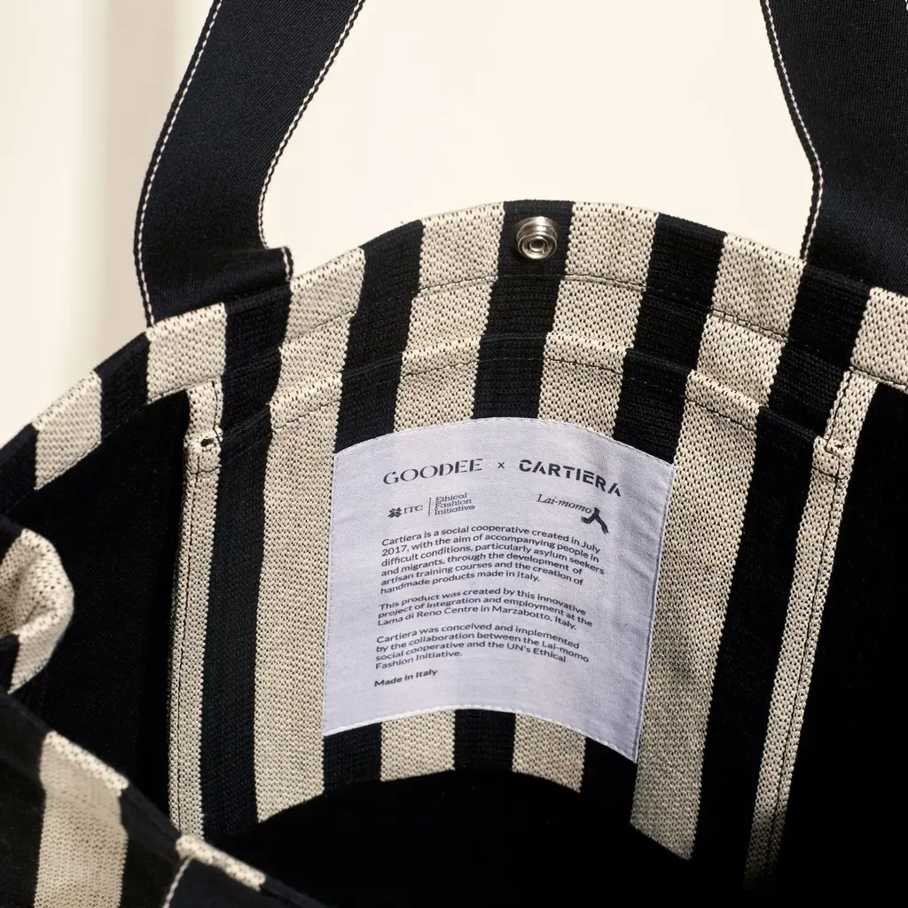 Whether to store your laptop or fine foods from the farmers’ market, the Bassi Market Tote is a bag you’ll carry with pride. Ethically handcrafted by refugees in Italy using handwoven fabric from Burkina Faso, this everyday carryall is truly a vessel for positive change. Purposeful and impactful, it cleverly features inside and outside pockets, a sustainable snap closure, and a key holder for your bag charms. * Final Sale.