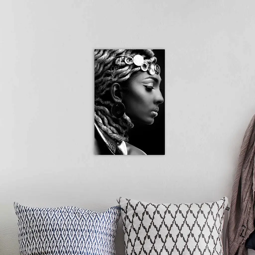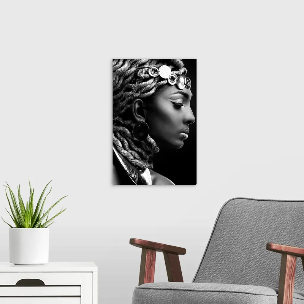 A black and white portrait of a woman in profile with an elaborate headdress.